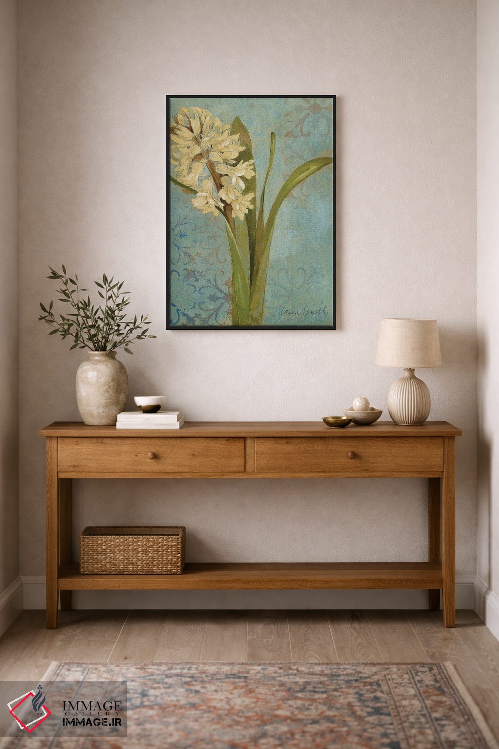 «"سنبل روی فیروزهای I"» اثرِ «لِینی لورث» میتواند مثل یک قطعهٔ دکورِ همیشهبهروز عمل کند؛ برای راهروهای مینیمال پیشنهاد میشود. فضا را شلوغ نمیکند؛ فقط لطیفترش میکند.
