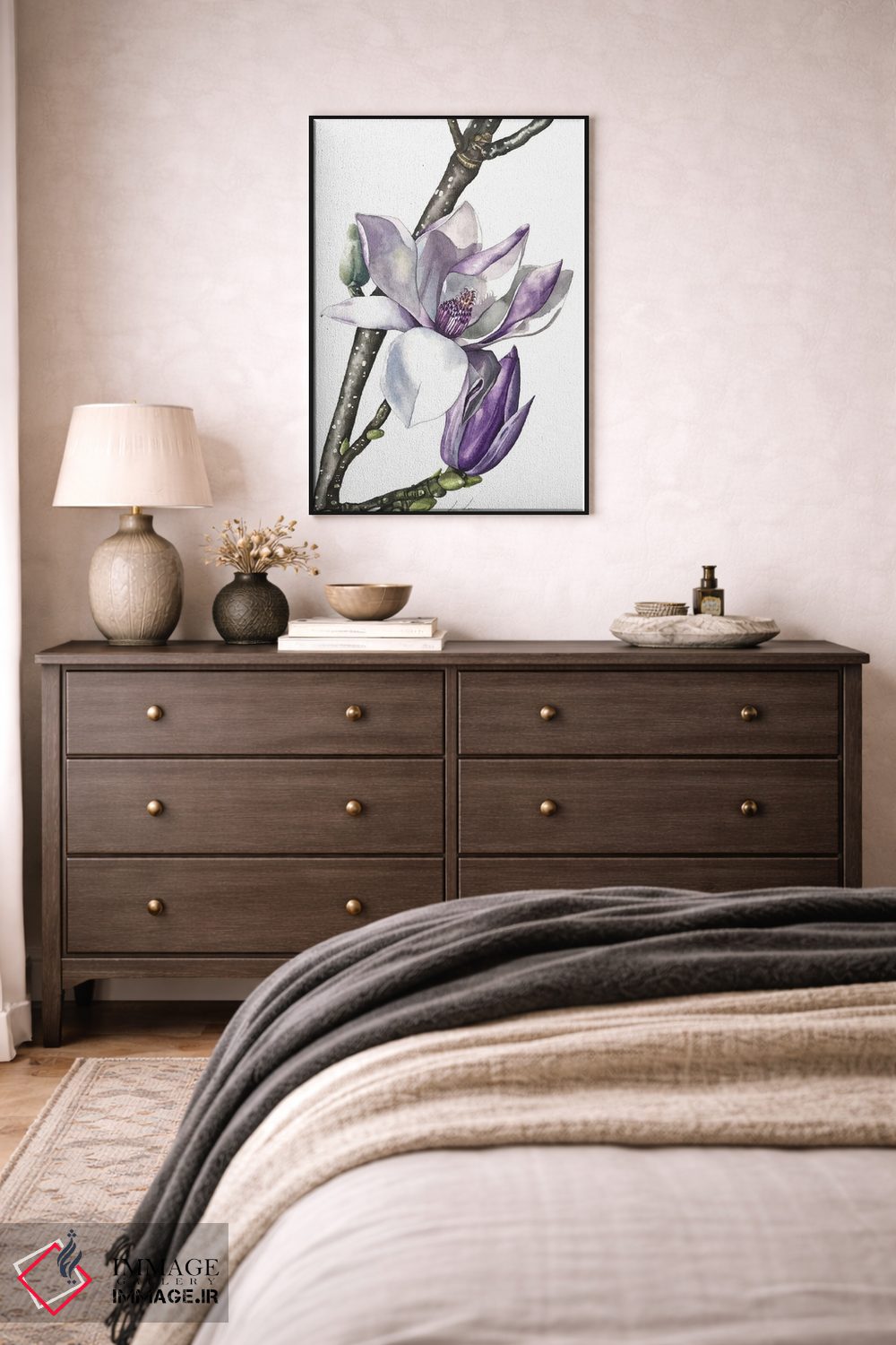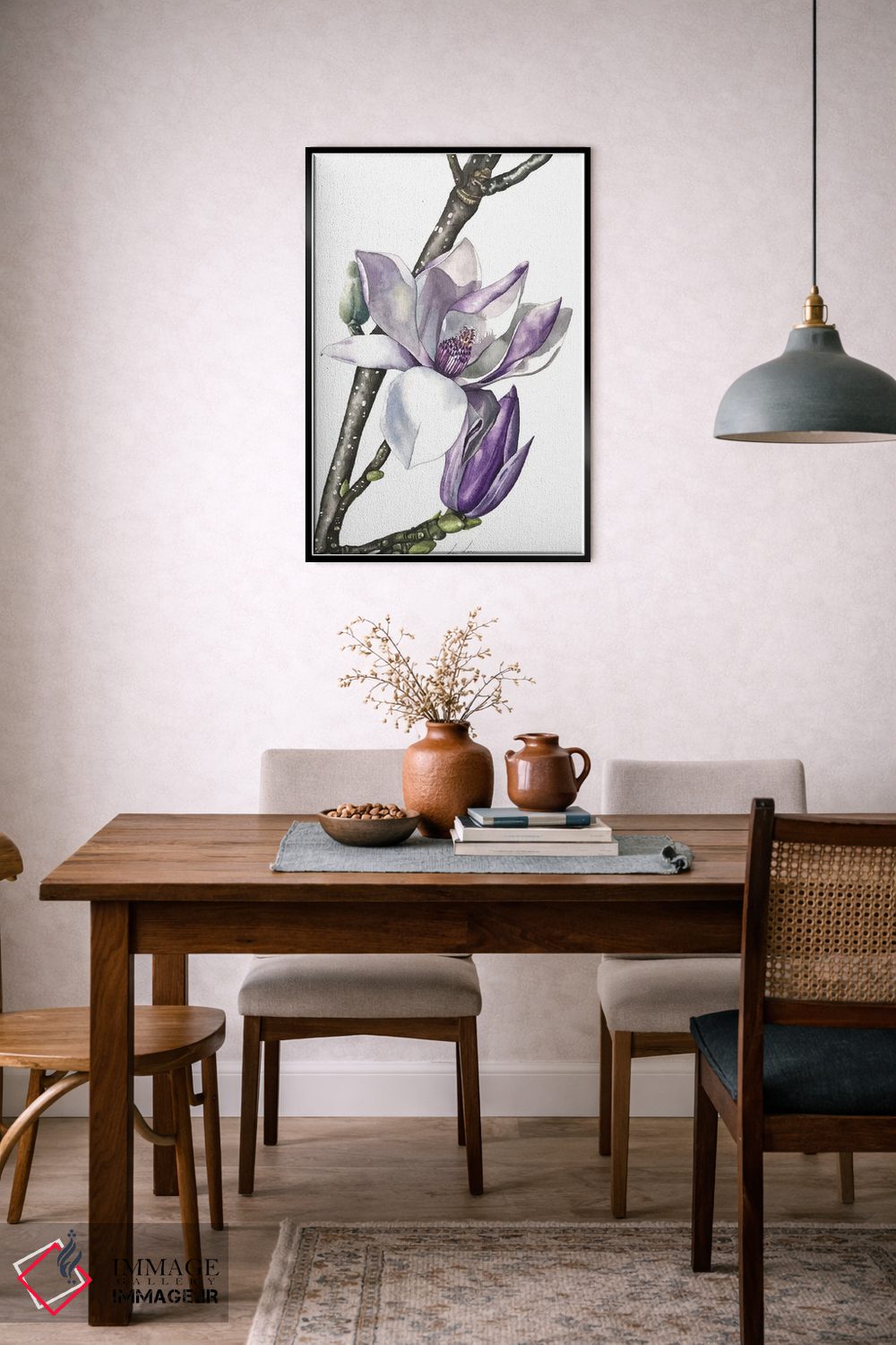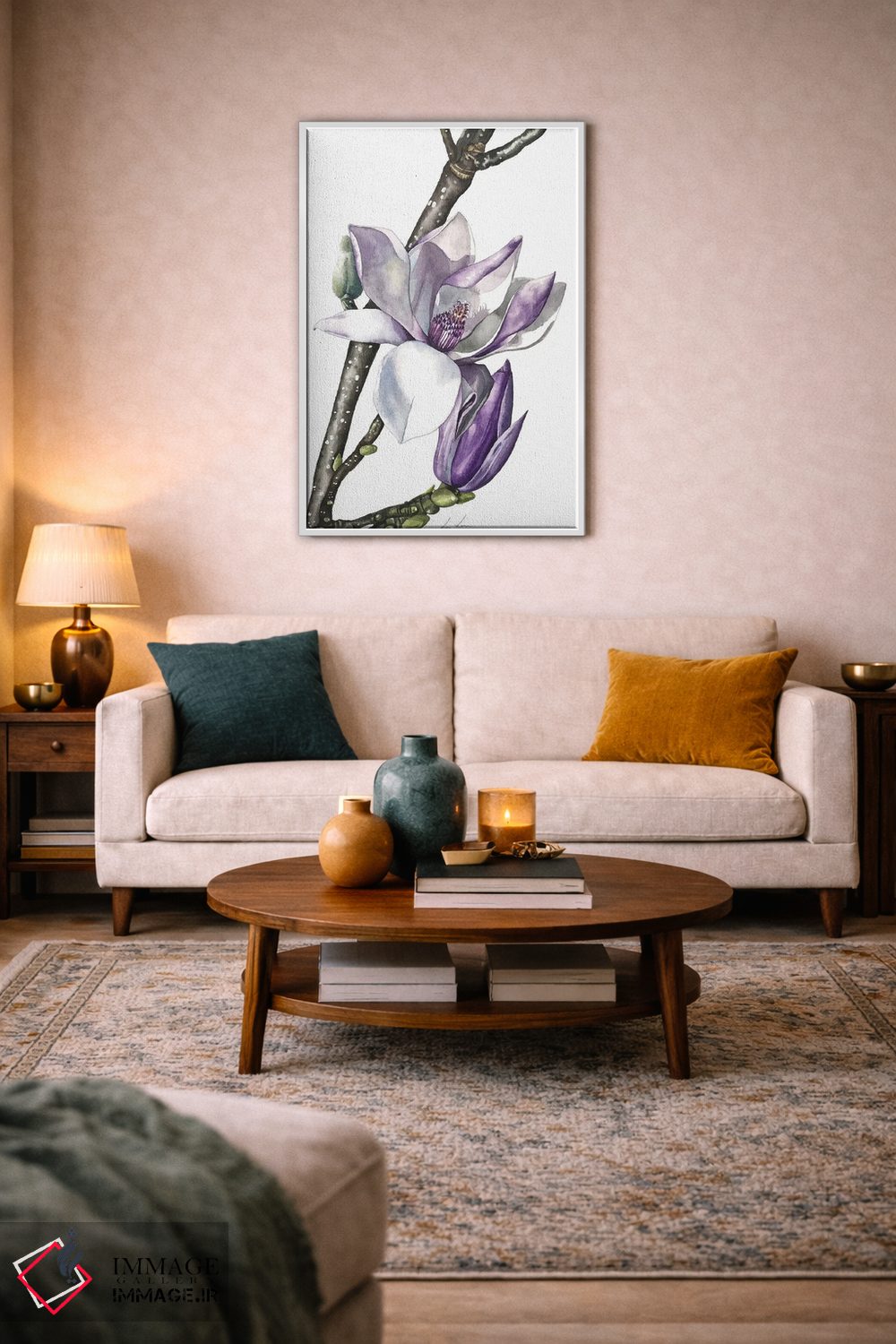 برای اتاق خواب و نشیمنهای آرام، «"مگنولیا"» اثرِ «لیزا لنون» تعادل رنگیِ لطیفی به چیدمان میدهد؛ برای نشیمنهای روشن انتخابی خوشسلیقه است. جزئیاتش از نزدیک هم ارزش تماشا دارد.