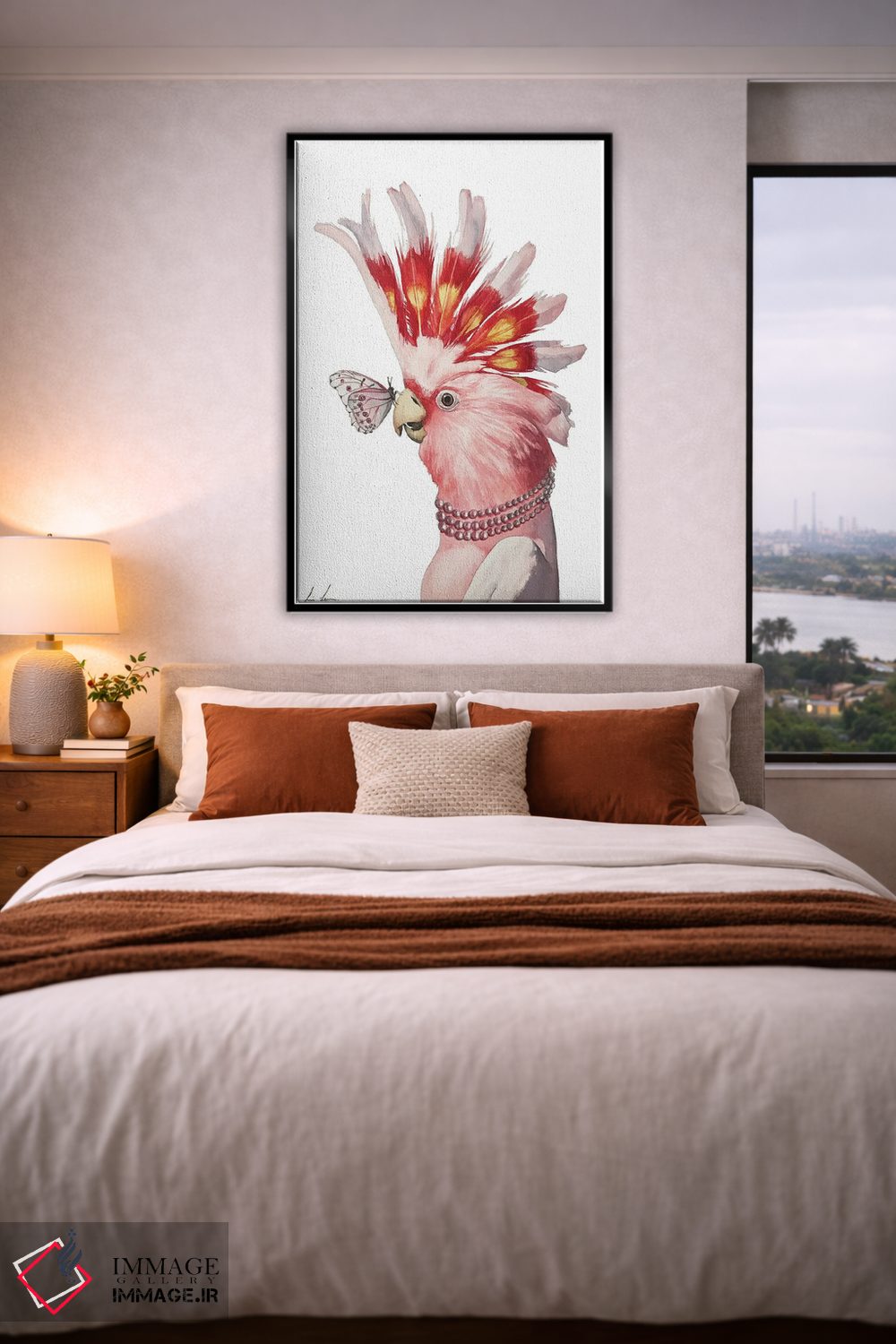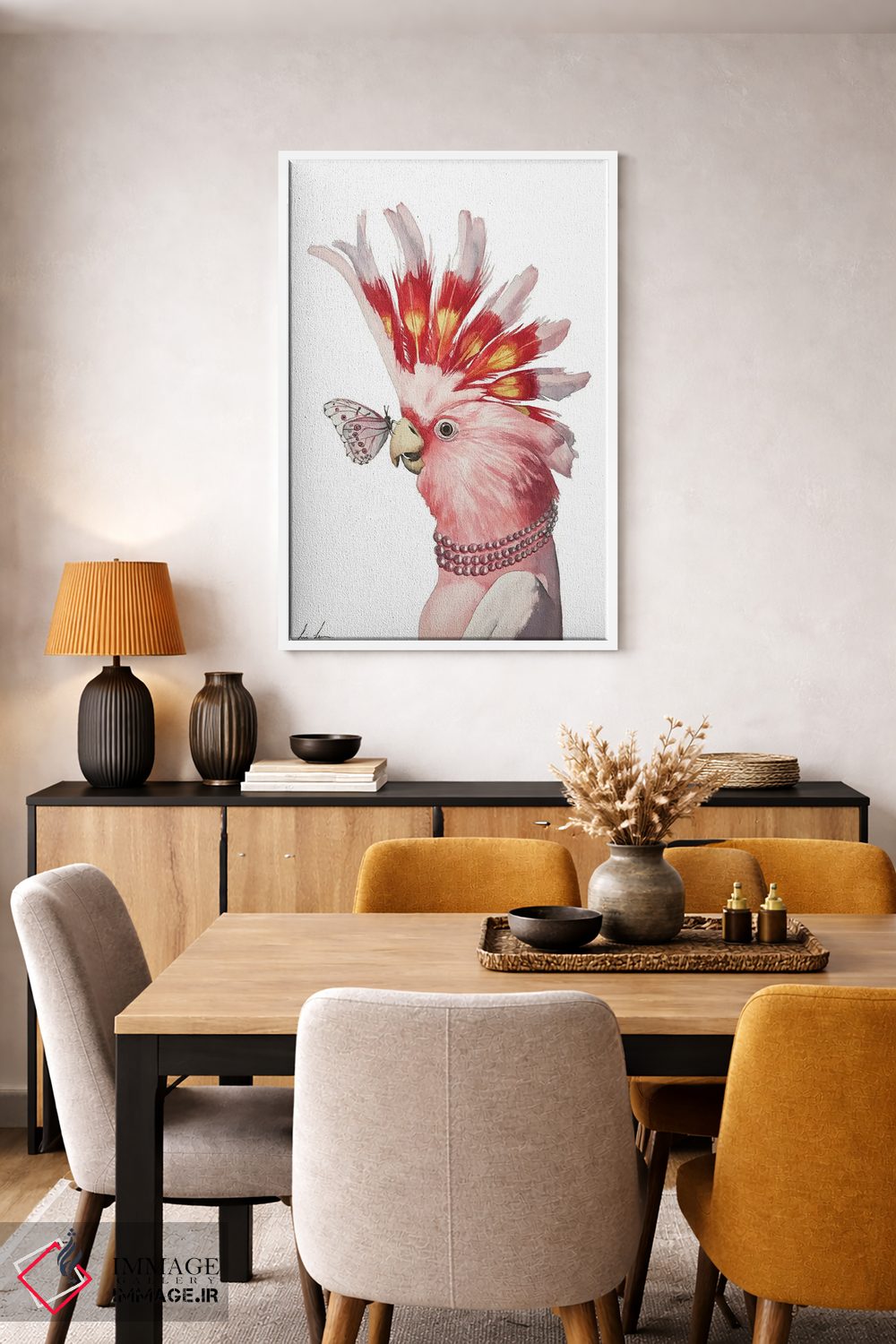 برای دکورهای صمیمی، «"کاکاتوی صورتی"» اثرِ «لیزا لنون» به دیوار، انرژیِ نرم و زنده میدهد؛ برای دیوار کنار میز کار انتخابی خوشسلیقه است. هر بار نگاهش میکنید، یک جزئیات تازه به چشم میآید.