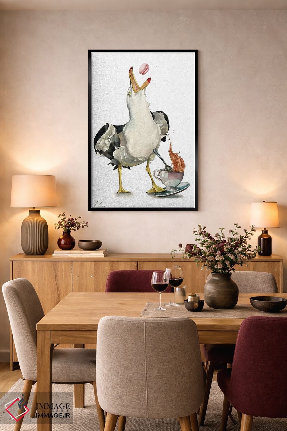 «"حرکات شیطنتآمیز مرغ دریایی"» اثرِ «لیزا لنون» برای کافهاستایلهای خانگی و دیوارهای نزدیک میز عالی است.