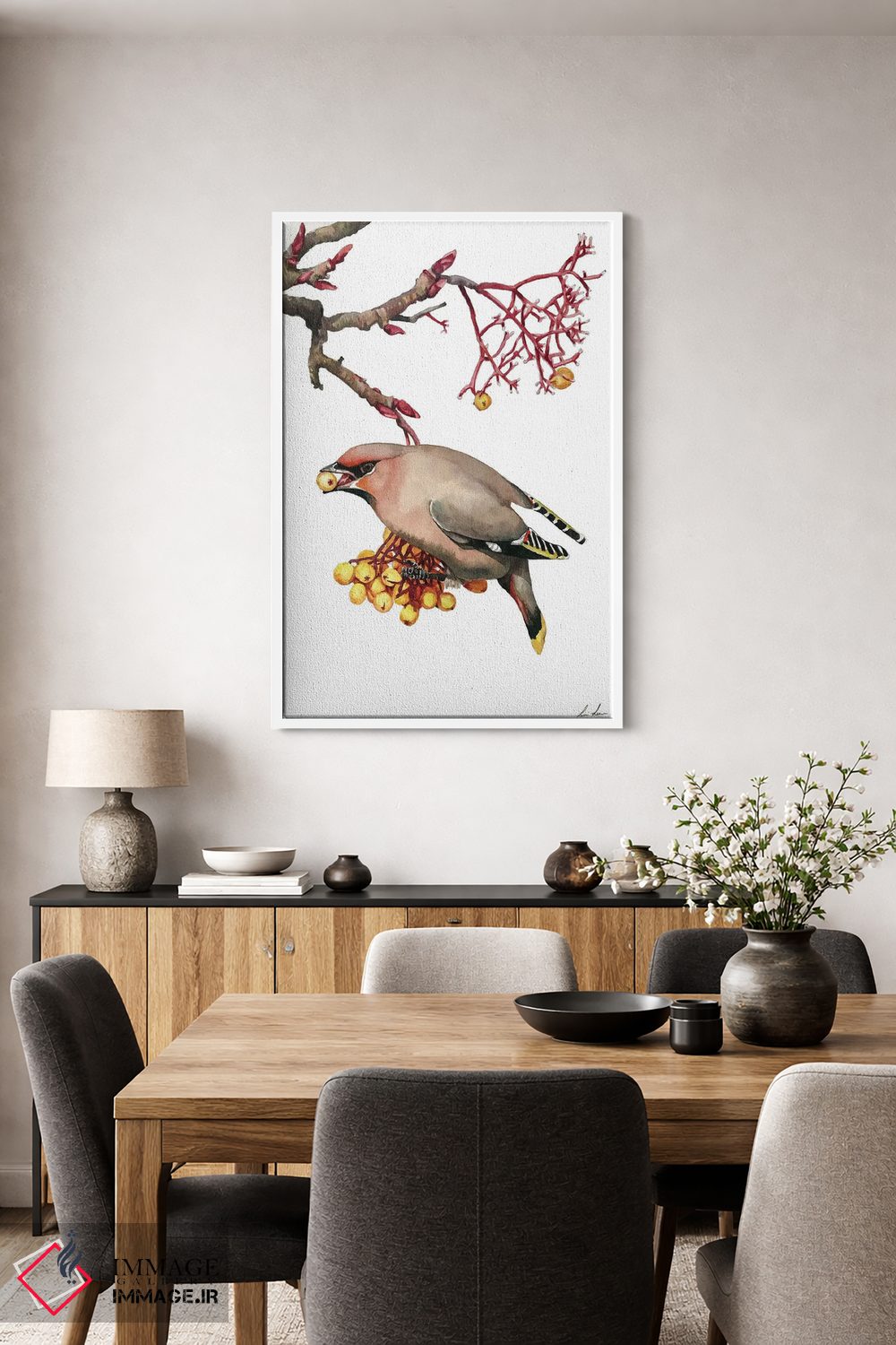 براساس پالت گرم اثر، قاب تیک گرم (چوبی) پیشنهاد اول است و مشکی مات (فریم متوسط) مکمل. برای سفارشهای پروژهای با ابعاد و قابهای اختصاصی با ایماژ در تماس باشید.