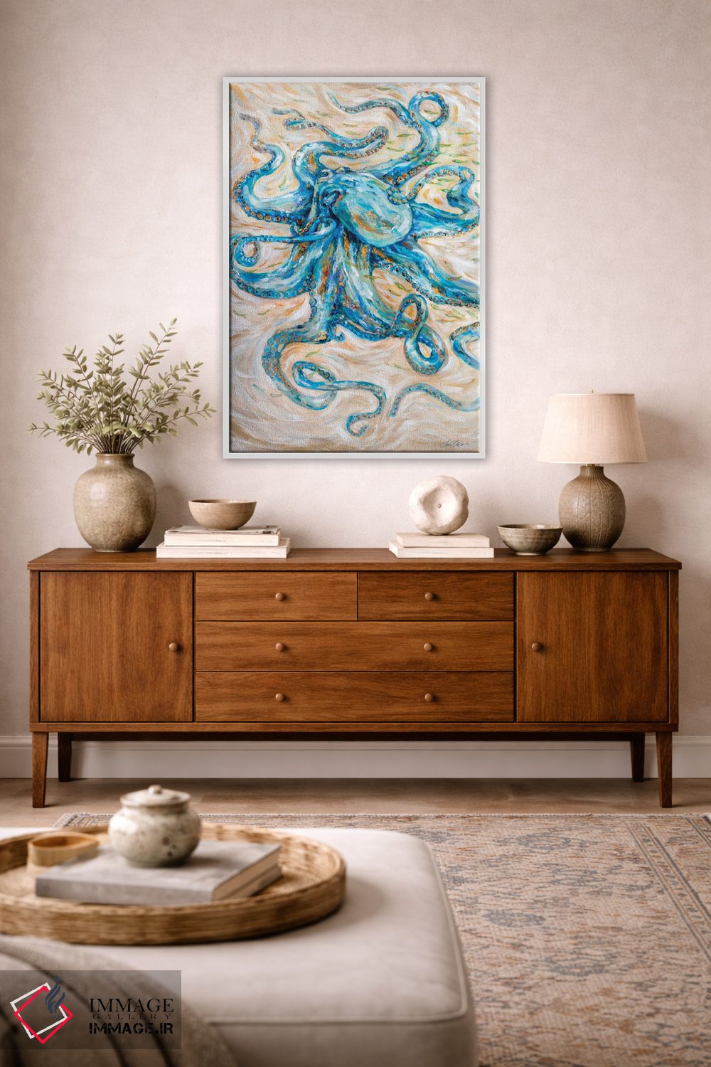 برای دکورهای صمیمی، «"هشتپا فیروزهای"» اثرِ «لیندا اولسن» برای دکورهای مینیمال، یک نقطهٔ توجه میسازد؛ برای اتاق بازی یا گوشهٔ مطالعه انتخابی خوشسلیقه است. با قاب چوبی یا مشکی، حس مرتبتری پیدا میکند.
