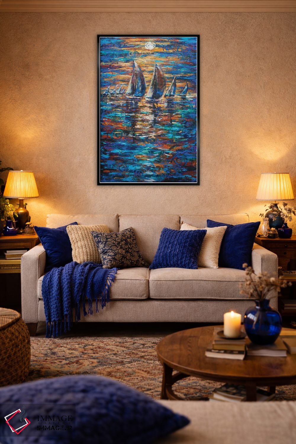 برای یک چیدمان تمیز، آبی را در رومیزی یا شمعها دوباره بیاورید تا نگاه به سمت اثر هدایت شود. اگر فضا شلوغ است، فقط یک نقطهٔ رنگی بس است.