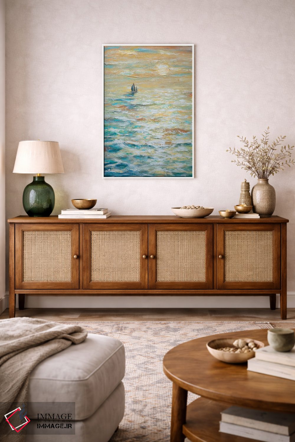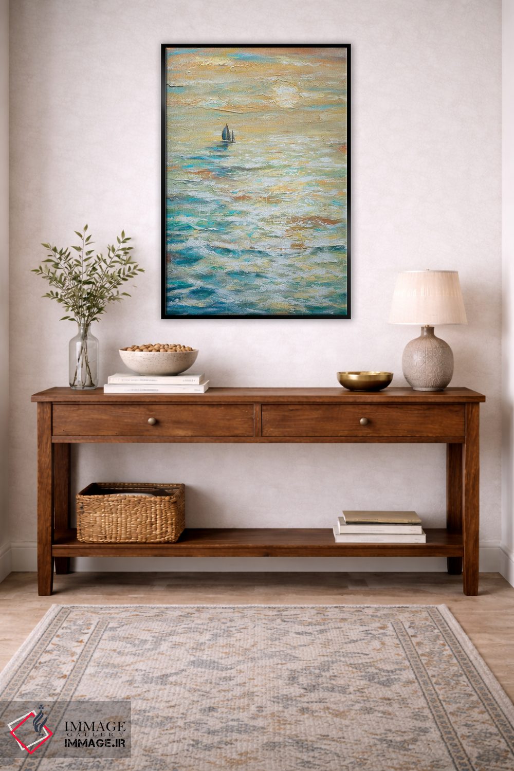 براساس پالت ترکیبی اثر، قاب بلوط روشن (چوبی) پیشنهاد اول است و استخوانی ملایم مکمل. برای سفارشهای پروژهای با ابعاد و قابهای اختصاصی با ایماژ در تماس باشید.