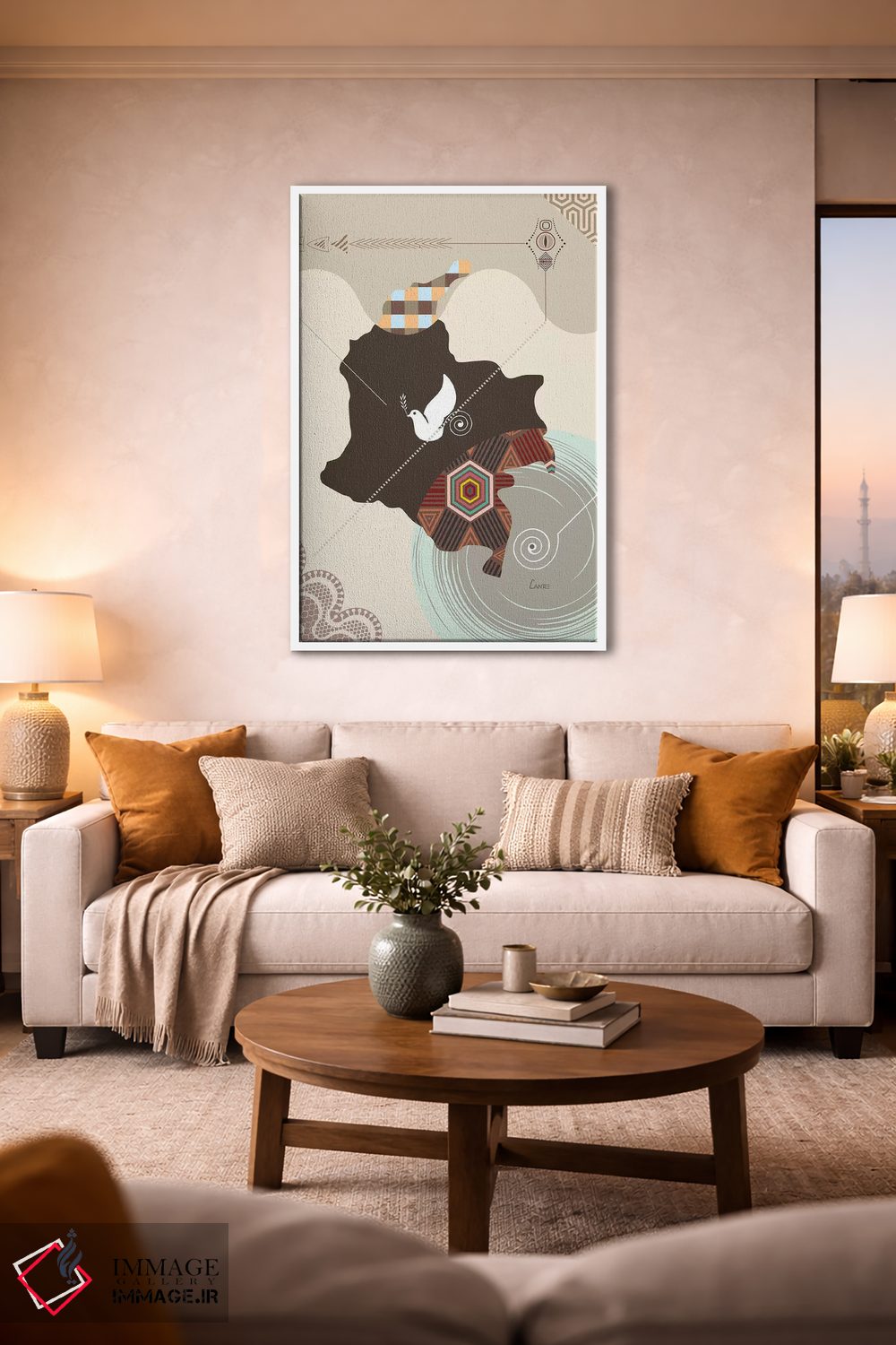 براساس پالت گرم اثر، قاب بلوط روشن (چوبی) پیشنهاد اول است و استخوانی ملایم مکمل. برای سفارشهای پروژهای با ابعاد و قابهای اختصاصی با ایماژ در تماس باشید.