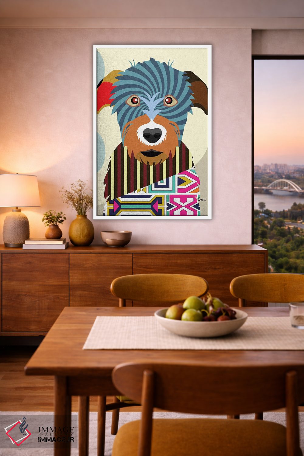 براساس پالت ترکیبی اثر، قاب تیک گرم (چوبی) پیشنهاد اول است و مشکی مات (فریم متوسط) مکمل. برای سفارشهای پروژهای با ابعاد و قابهای اختصاصی با ایماژ در تماس باشید.