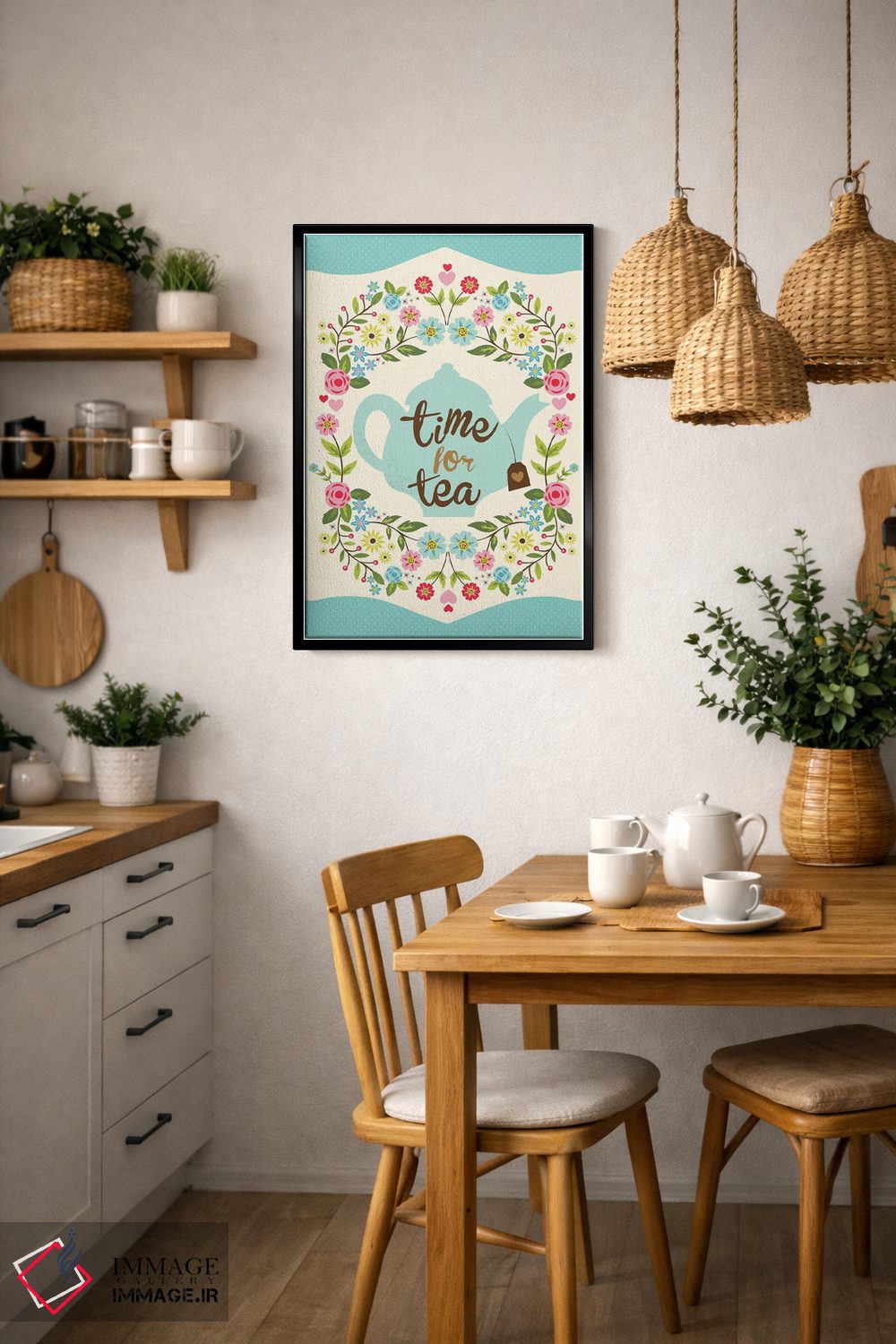 براساس پالت ترکیبی اثر، قاب تیک گرم (چوبی) پیشنهاد اول است و مشکی مات (فریم متوسط) مکمل.