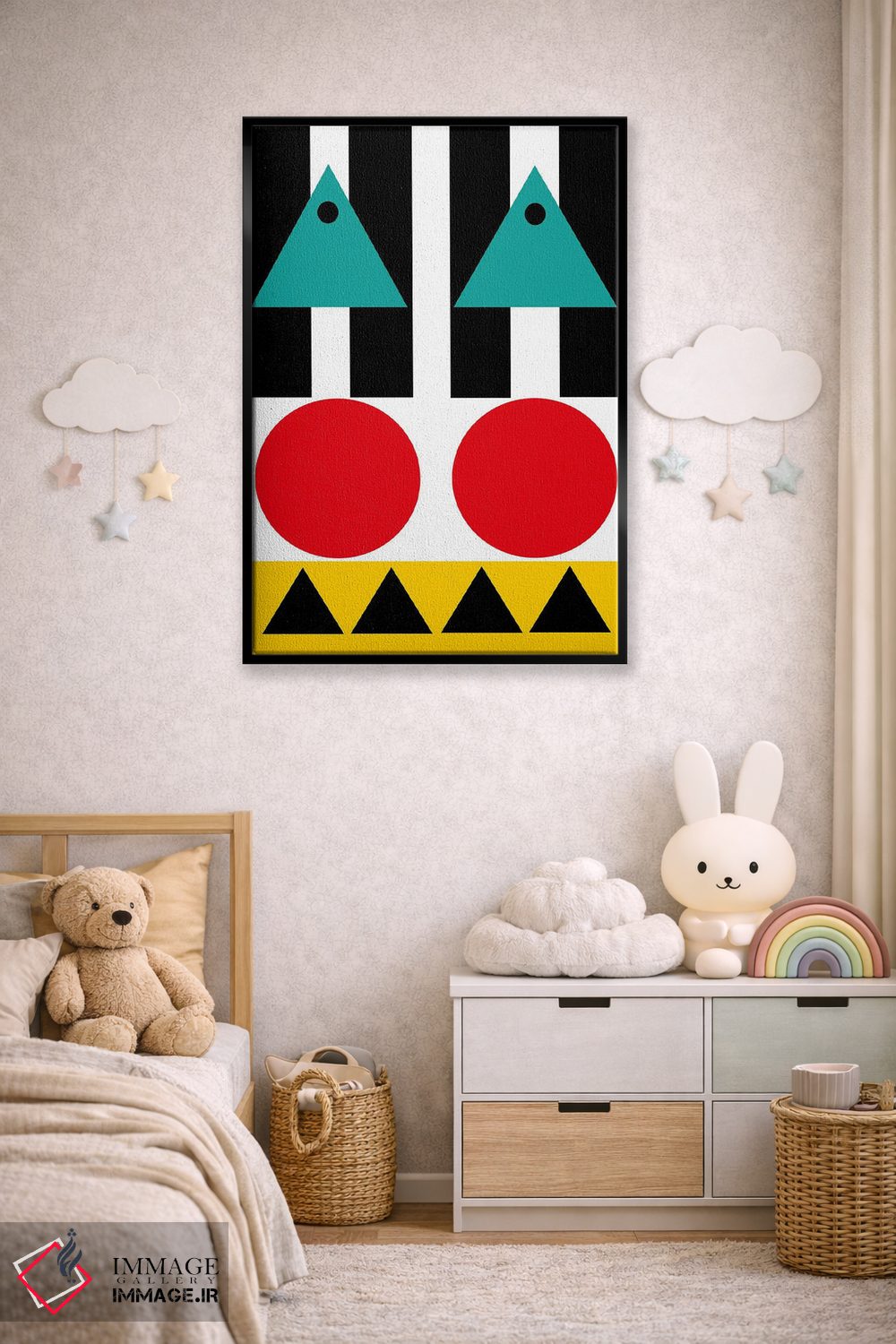 براساس پالت ترکیبی اثر، قاب تیک گرم (چوبی) پیشنهاد اول است و مشکی مات (فریم متوسط) مکمل. برای سفارشهای پروژهای با ابعاد و قابهای اختصاصی با ایماژ در تماس باشید.