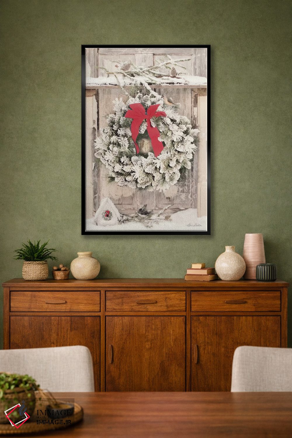 براساس پالت گرم اثر، قاب بلوط روشن (چوبی) پیشنهاد اول است و استخوانی ملایم مکمل. برای سفارشهای پروژهای با ابعاد و قابهای اختصاصی با ایماژ در تماس باشید.