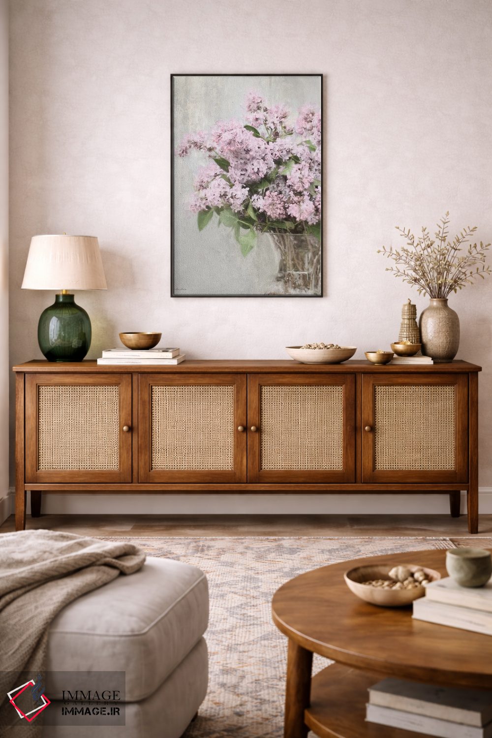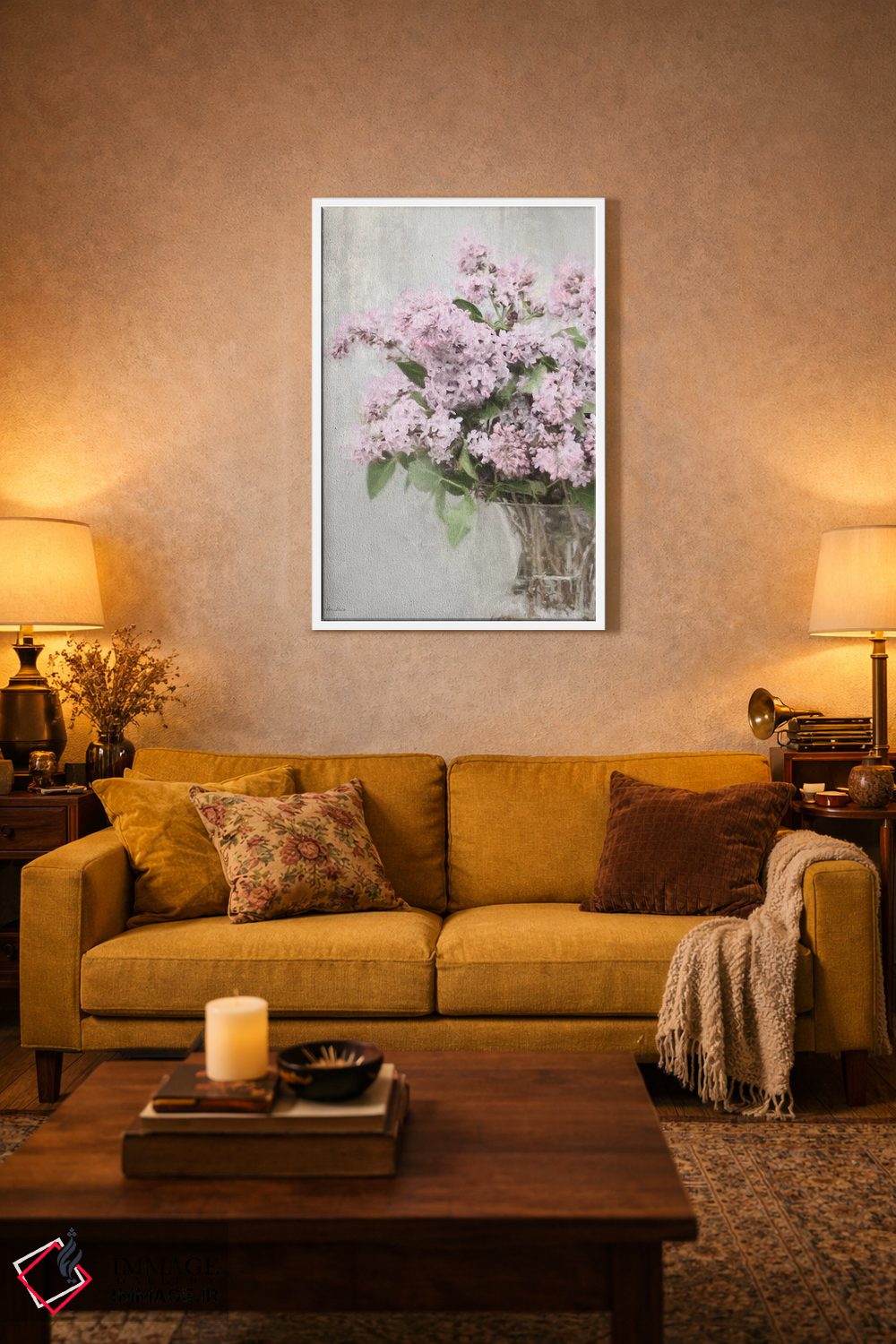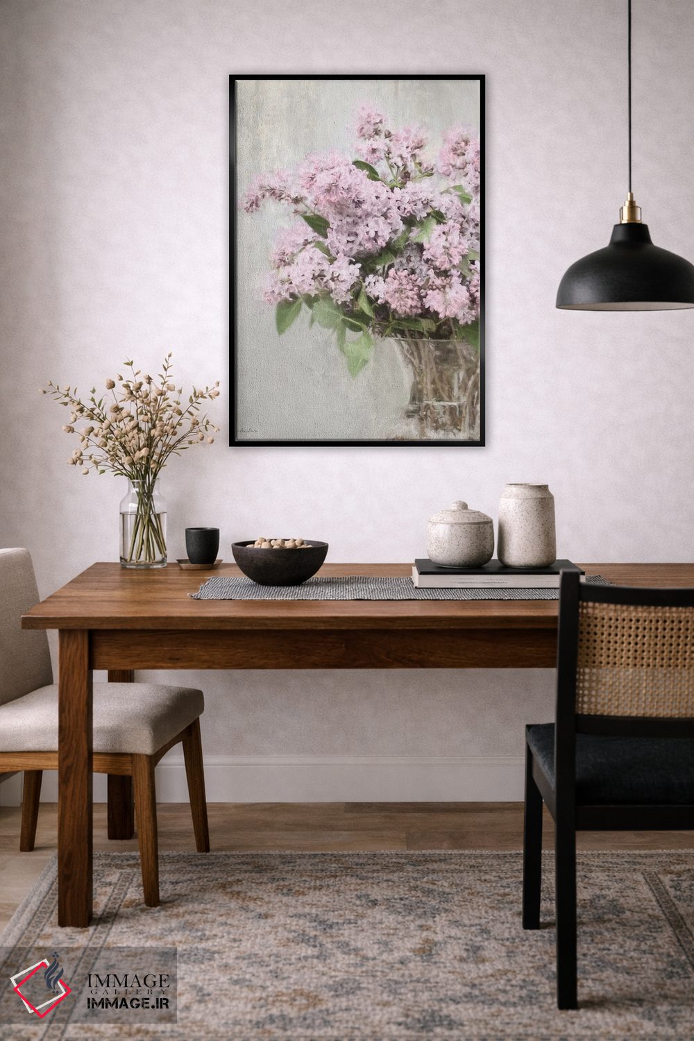 اگر دوست دارید دیوار روشنتر و آرامتر دیده شود، «"بنفشههای جادویی"» اثرِ «لری دیتِر» در کنار چوب و پارچههای روشن، عالی مینشیند، برای کنار میز آرایش یا کنسول گزینهٔ مناسبیست. با قاب روشن یا چوبی، حس طبیعیتری پیدا میکند.