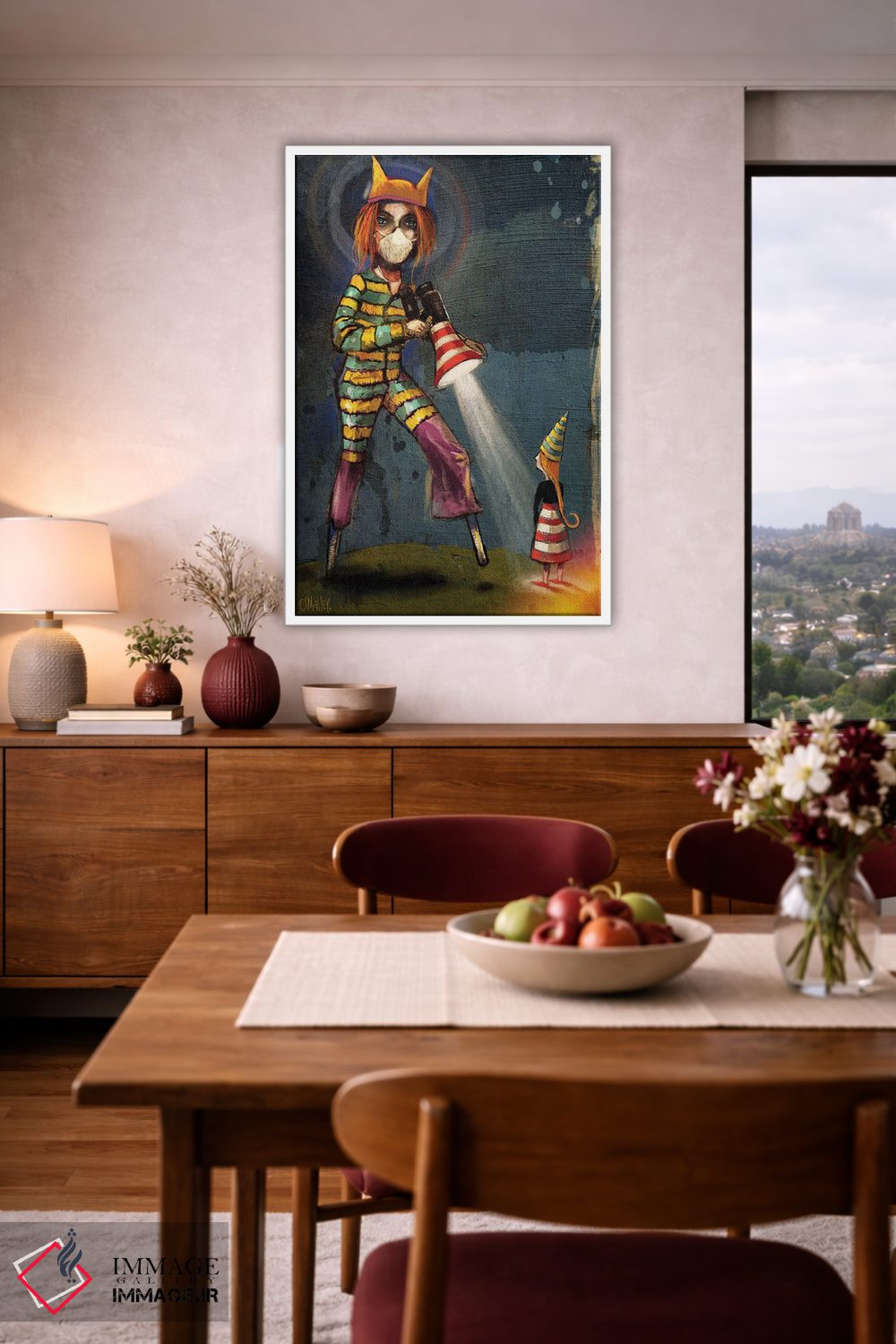 بوم گالری ایماژ طوری طراحی شده که اثر روی دیوار «پرداختشده» و همچنین حرفهای دیده شود—نه پرزرقوبرقِ بیپایه؛ بلکه دقیق و خوشپرداخت. بافت ظریف کنواس باعث میشود حس اثر هنری را در نگاه نزدیک نگه میدارد بدون اغراق؛ فقط دقیقتر. با چاپ جیکلی (Giclée)، گرباورهاها را تمیزتر و طبیعیتر نشان میدهد و همین «پرداخت» تفاوت را میسازد. حاصل کار، یک تابلو خوشنشین است که هم از دور اثرگذار است و هم از نزدیک خوشخوان؛ و اگر بخواهید، میتوان چیدمان را برای گالریوال هم پیشنهاد داد. در دیوارهای خنثی (سفید، کرم، طوسی روشن) اثر تمیزتر خودش را نشان میدهد.