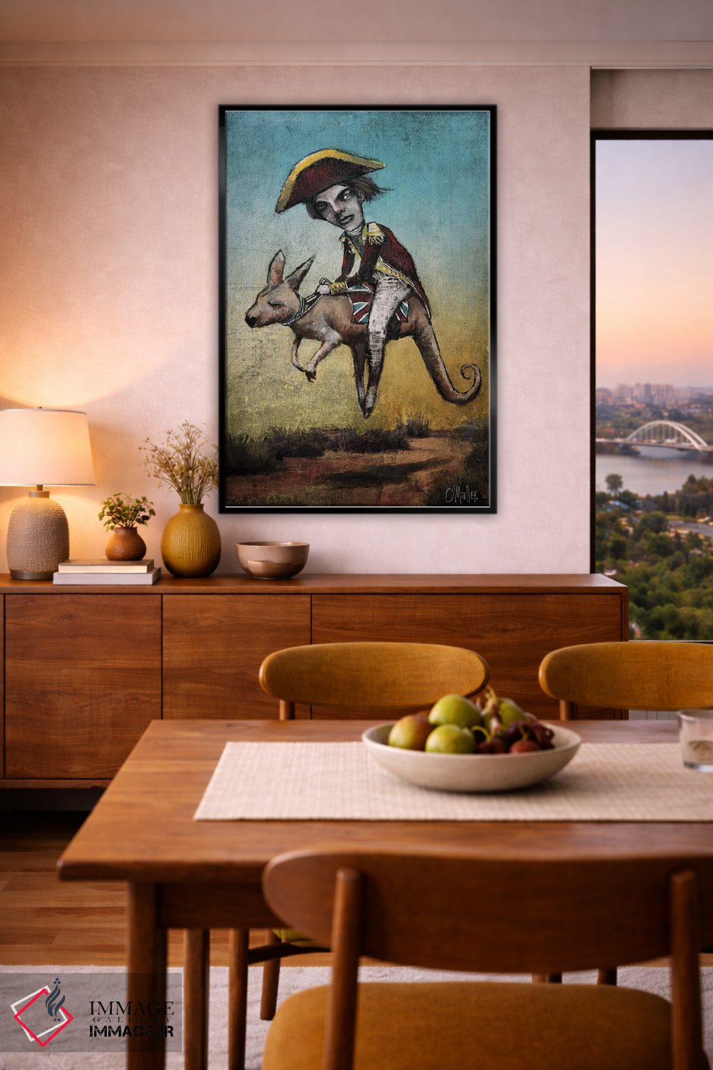 براساس پالت ترکیبی اثر، قاب تیک گرم (چوبی) پیشنهاد اول است و مشکی مات (فریم متوسط) مکمل. برای سفارشهای پروژهای با ابعاد و قابهای اختصاصی با ایماژ در تماس باشید.