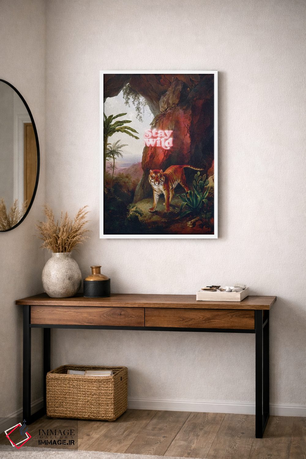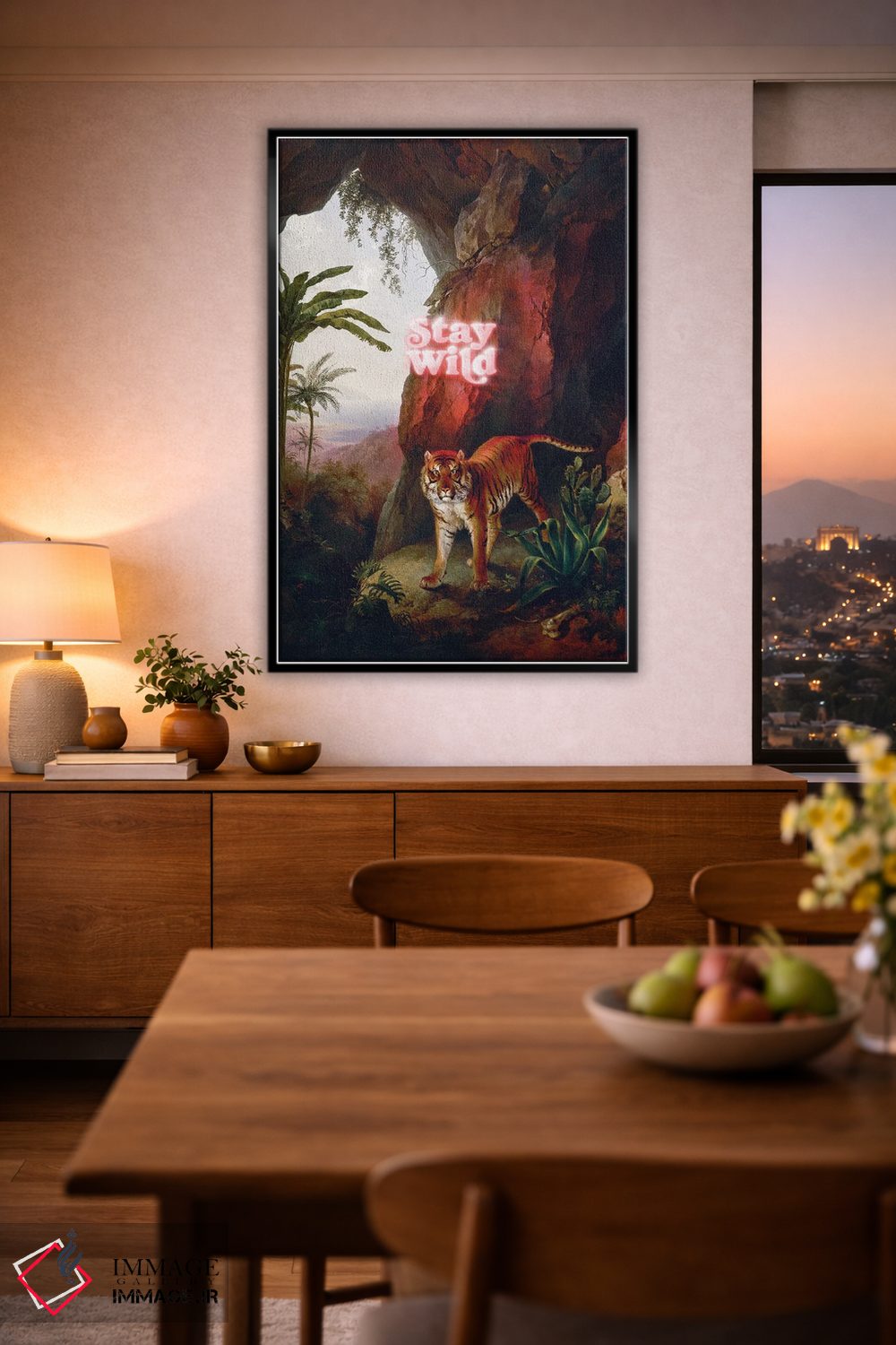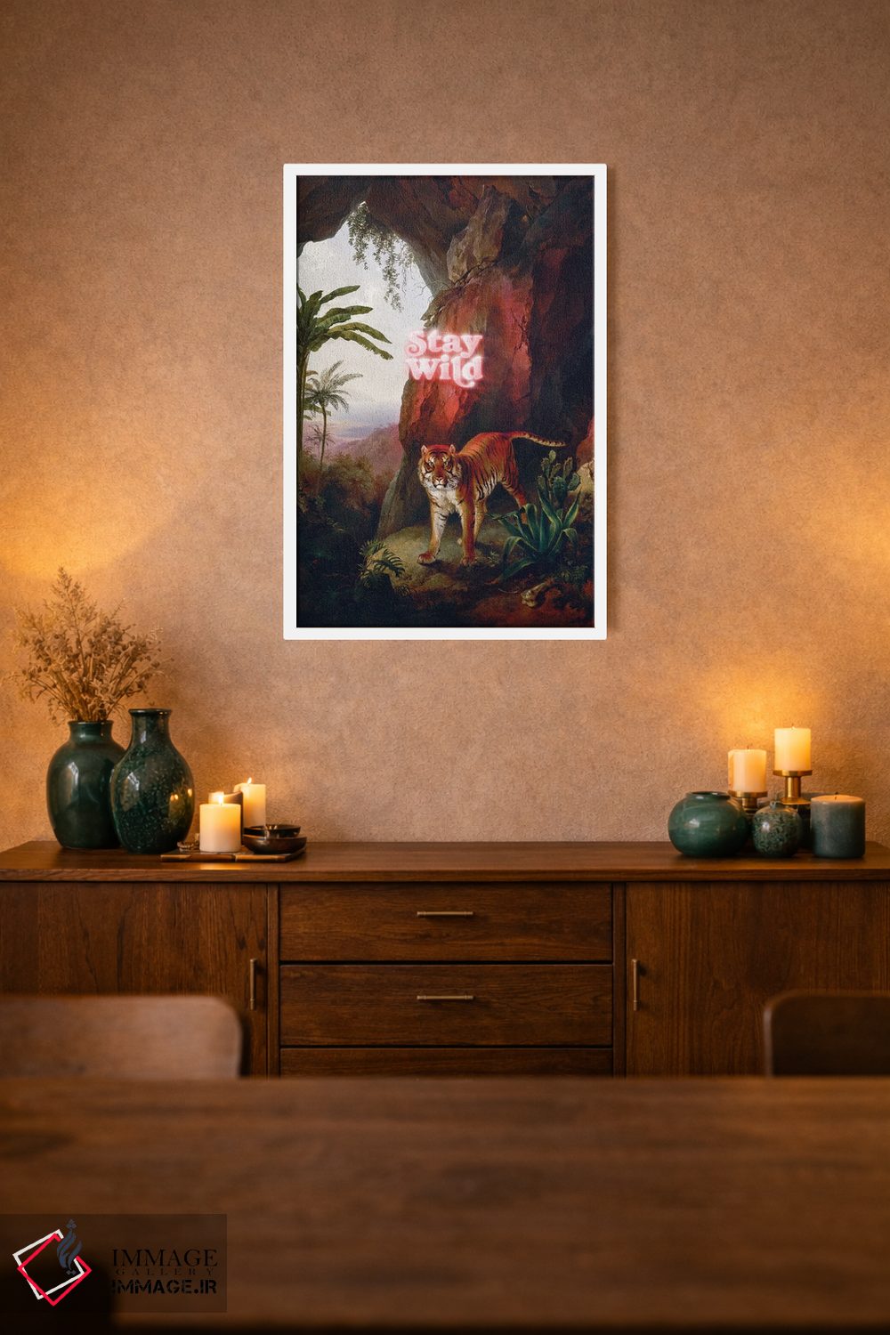 براساس پالت گرم اثر، قاب تیک گرم (چوبی) پیشنهاد اول است و مشکی مات (فریم متوسط) مکمل. برای سفارشهای پروژهای با ابعاد و قابهای اختصاصی با ایماژ در تماس باشید.