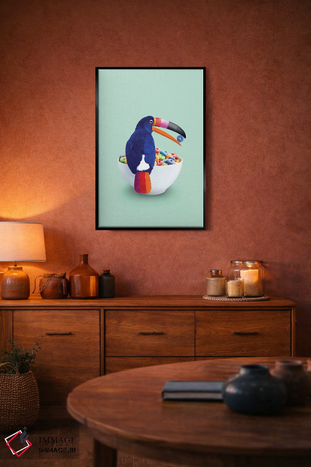 براساس پالت ترکیبی اثر، قاب تیک گرم (چوبی) پیشنهاد اول است و مشکی مات (فریم متوسط) مکمل. برای سفارشهای پروژهای با ابعاد و قابهای اختصاصی با ایماژ در تماس باشید.