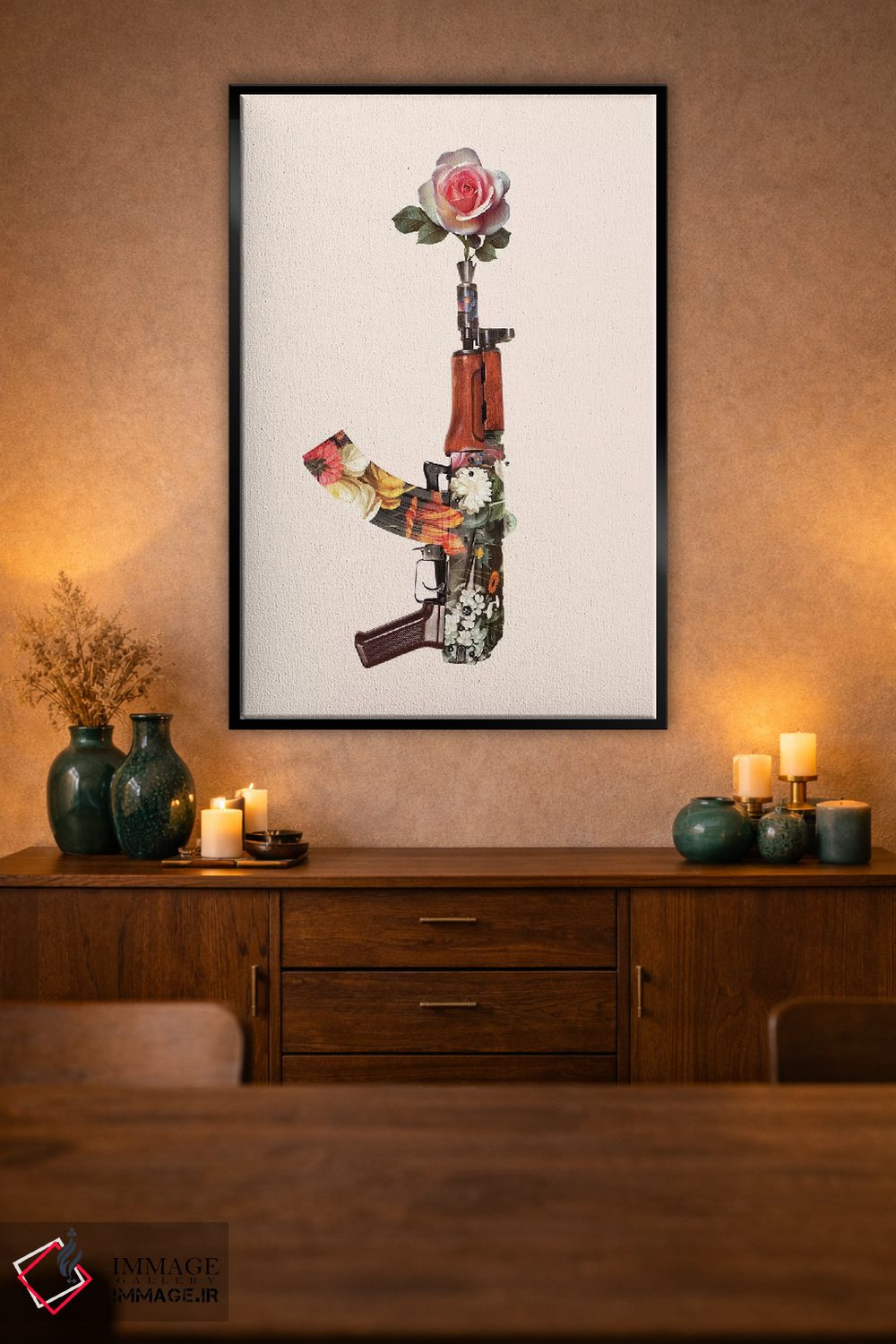 براساس پالت گرم اثر، قاب تیک گرم (چوبی) پیشنهاد اول است و مشکی مات (فریم متوسط) مکمل. برای سفارشهای پروژهای با ابعاد و قابهای اختصاصی با ایماژ در تماس باشید.