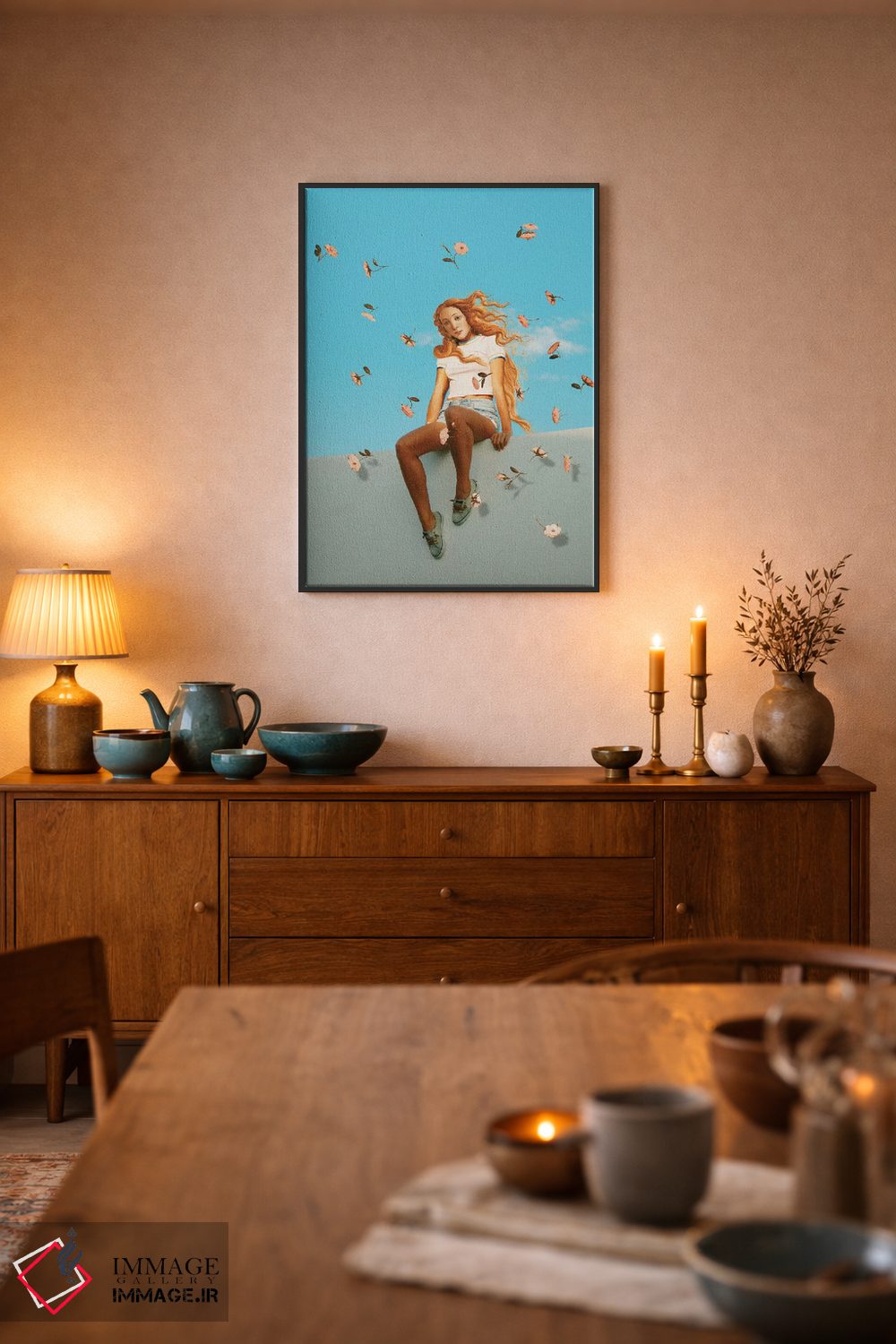 براساس پالت ترکیبی اثر، قاب تیک گرم (چوبی) پیشنهاد اول است و مشکی مات (فریم متوسط) مکمل.