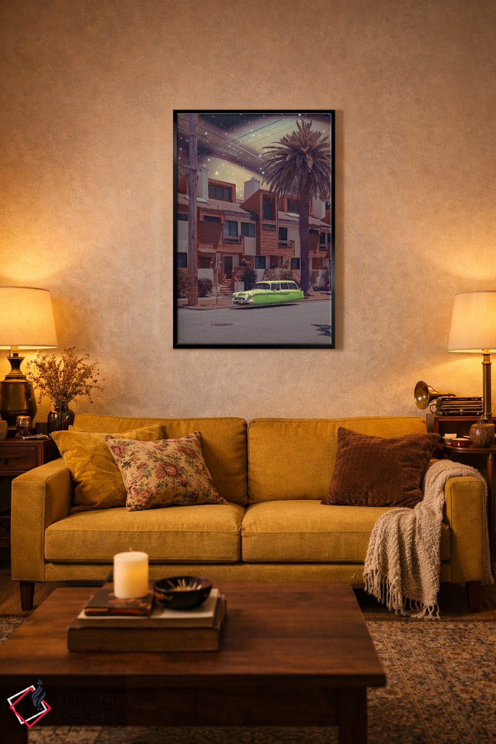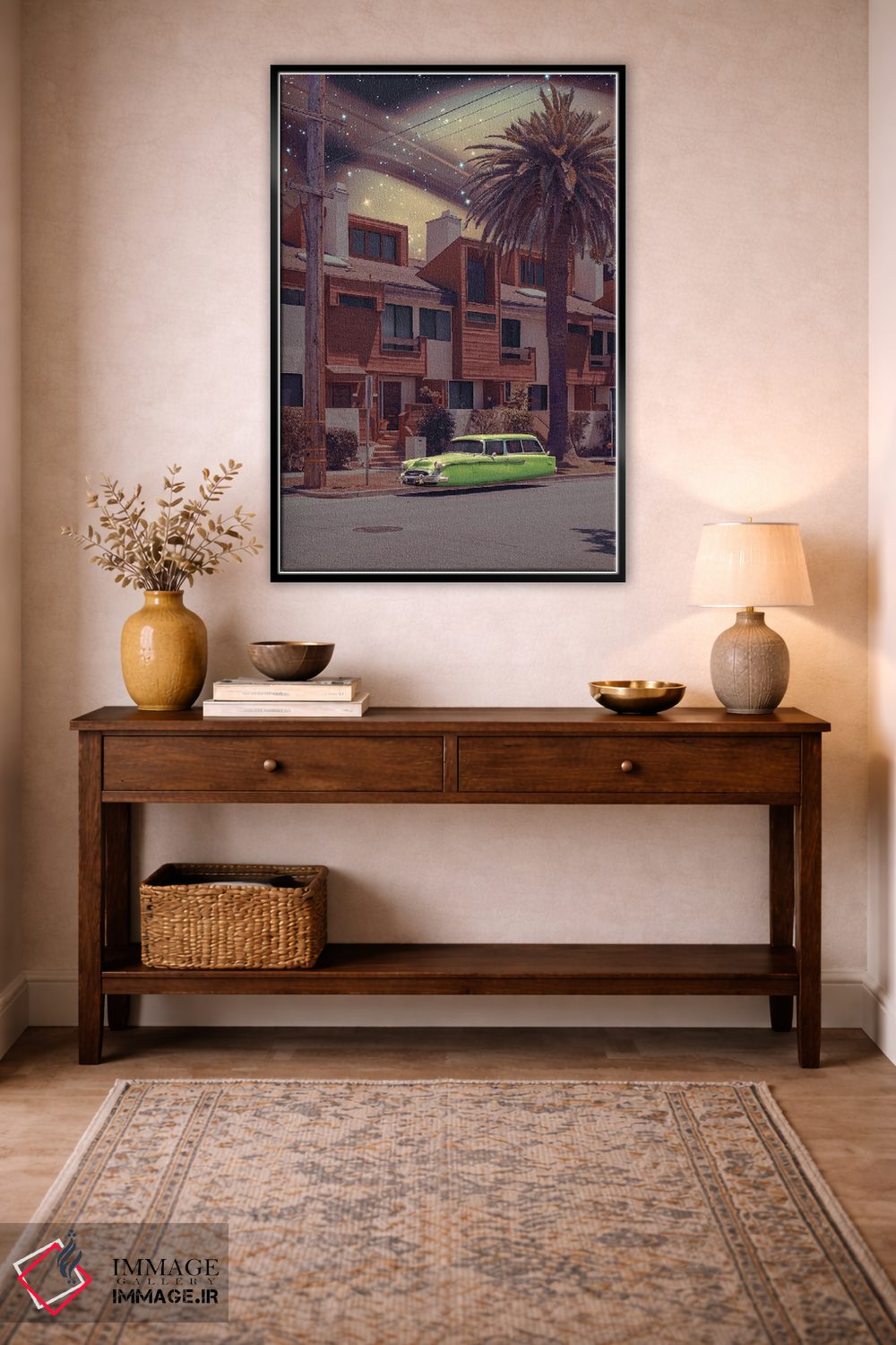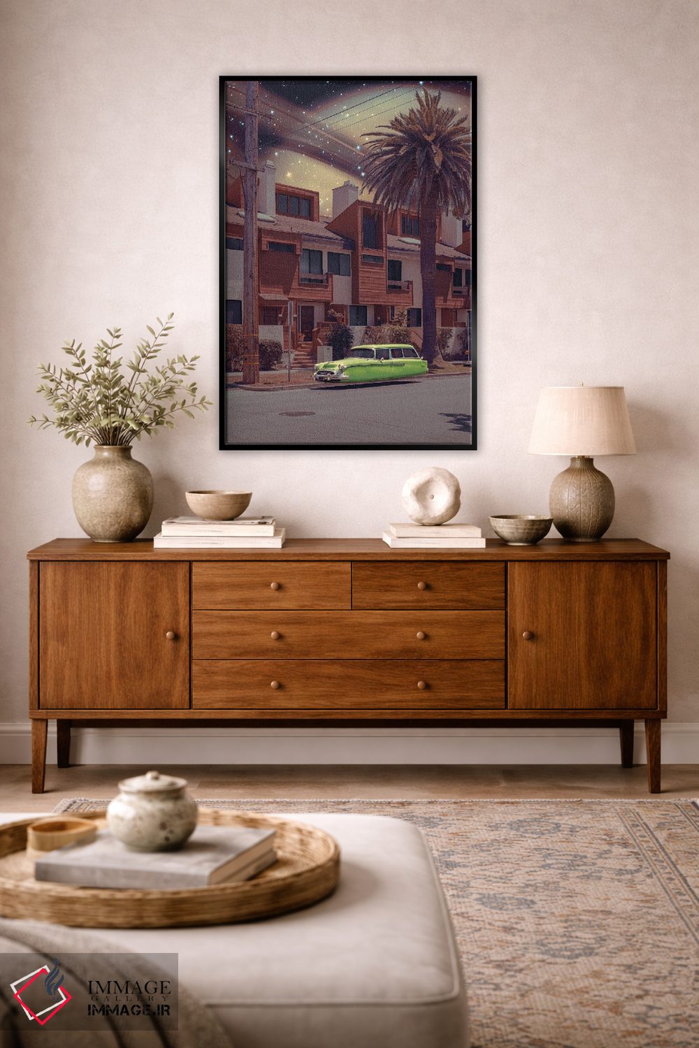 براساس پالت ترکیبی اثر، قاب تیک گرم (چوبی) پیشنهاد اول است و مشکی مات (فریم متوسط) مکمل. برای سفارشهای پروژهای با ابعاد و قابهای اختصاصی با ایماژ در تماس باشید.