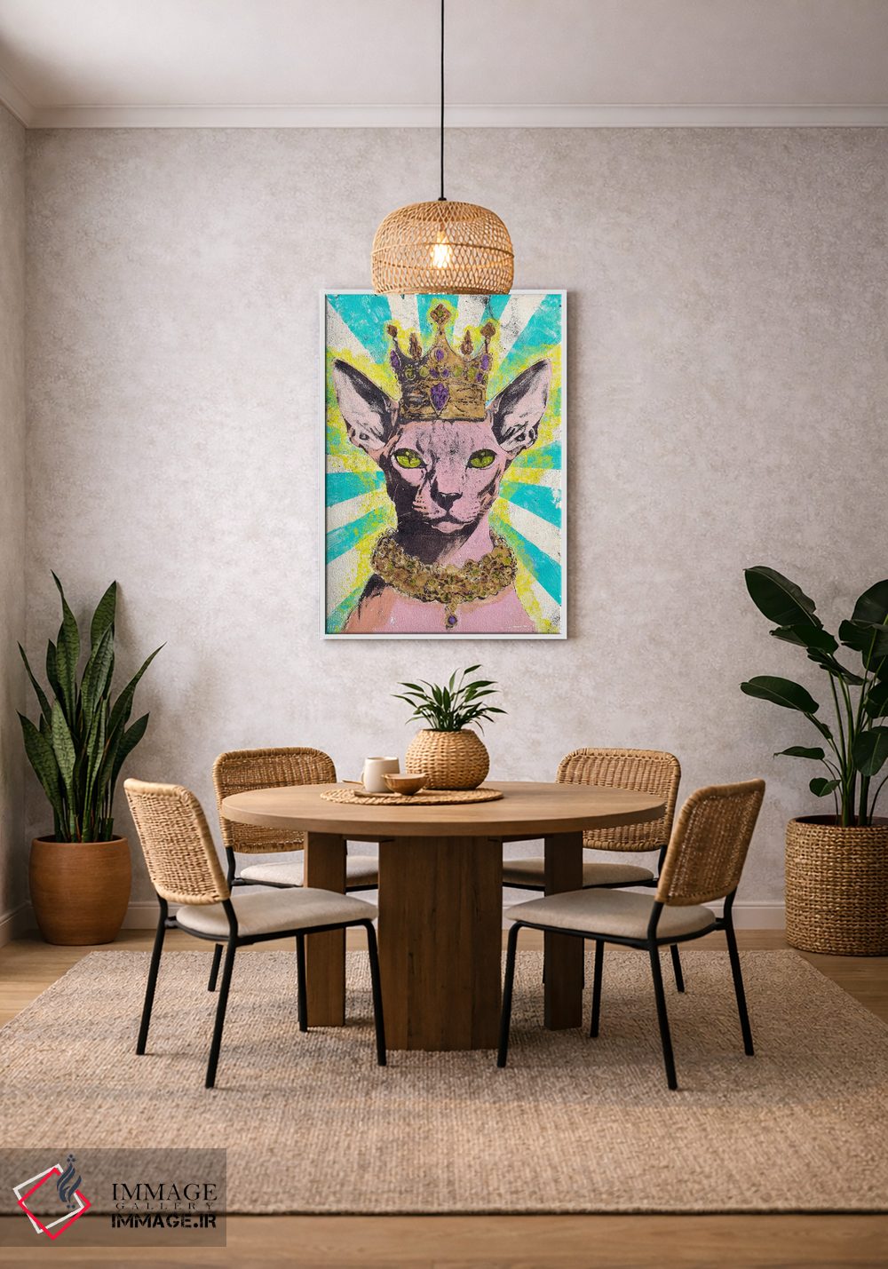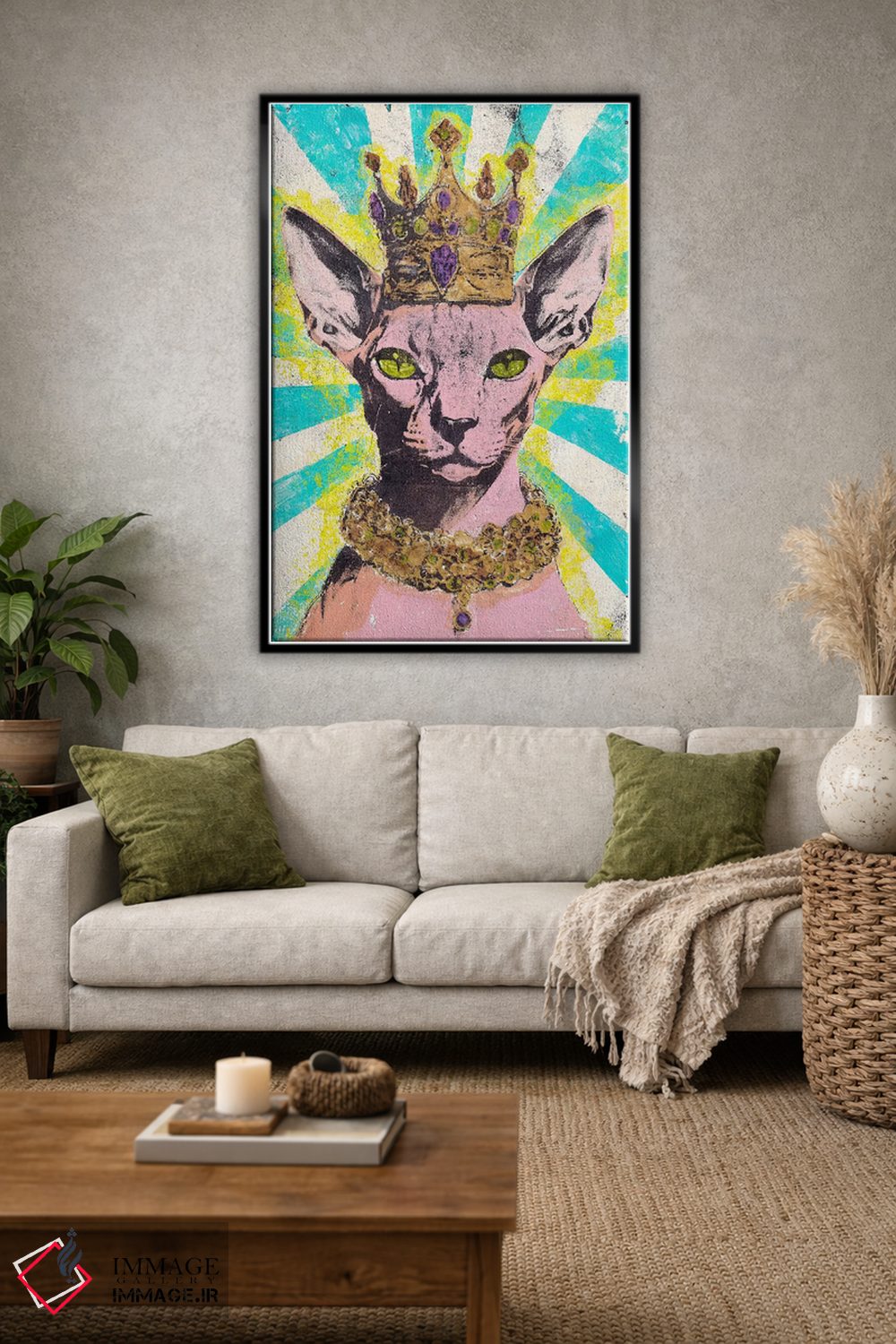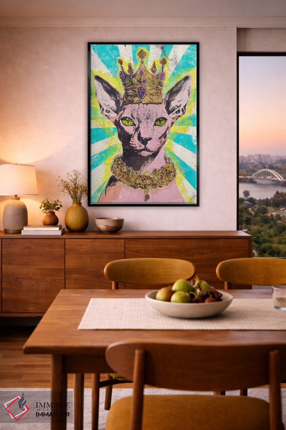 براساس پالت ترکیبی اثر، قاب تیک گرم (چوبی) پیشنهاد اول است و مشکی مات (فریم متوسط) مکمل. برای سفارشهای پروژهای با ابعاد و قابهای اختصاصی با ایماژ در تماس باشید.