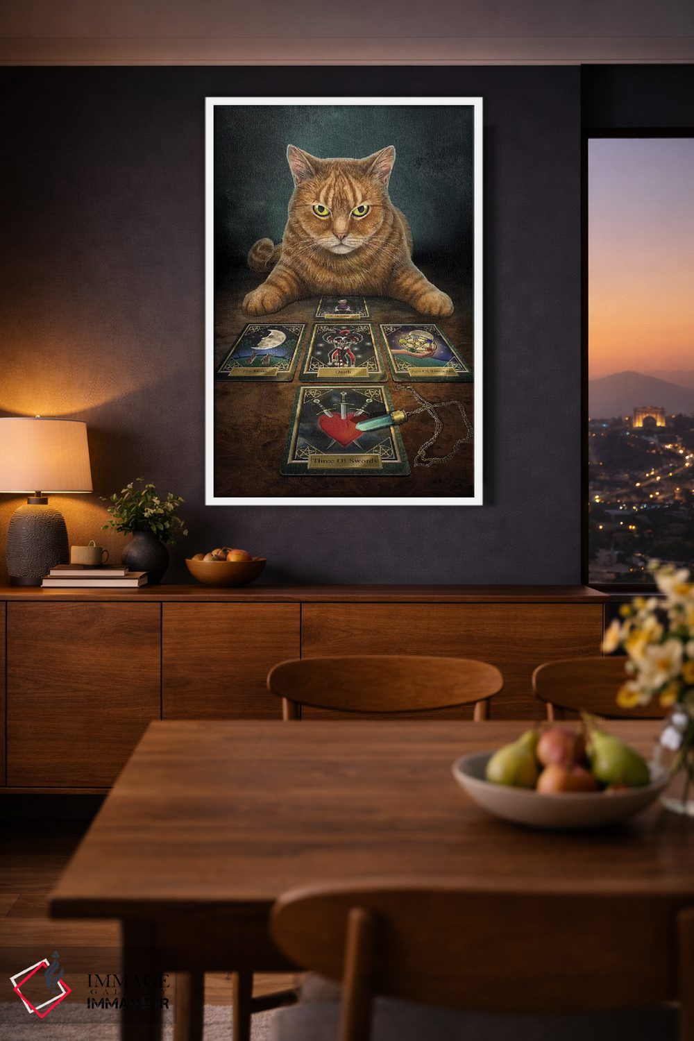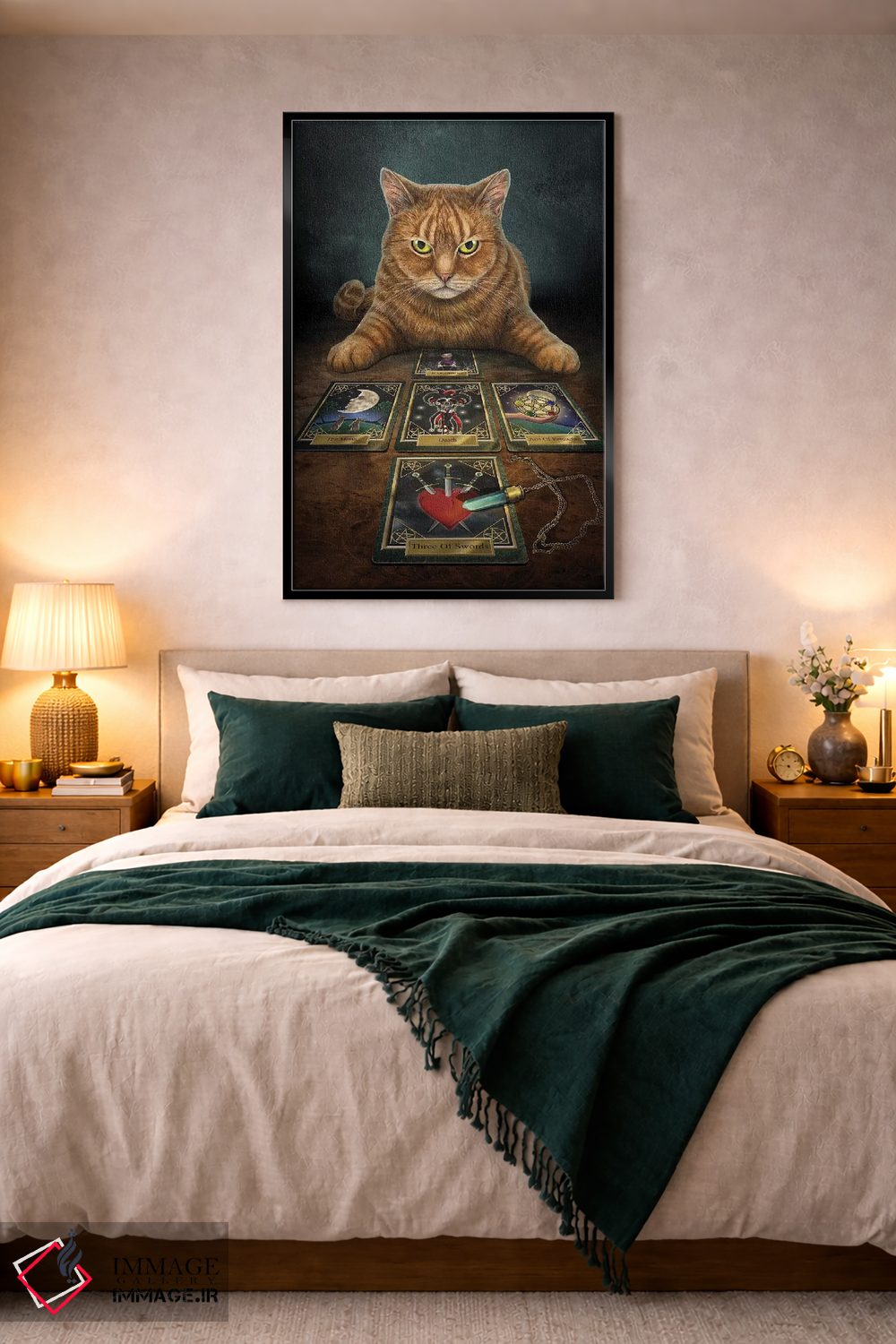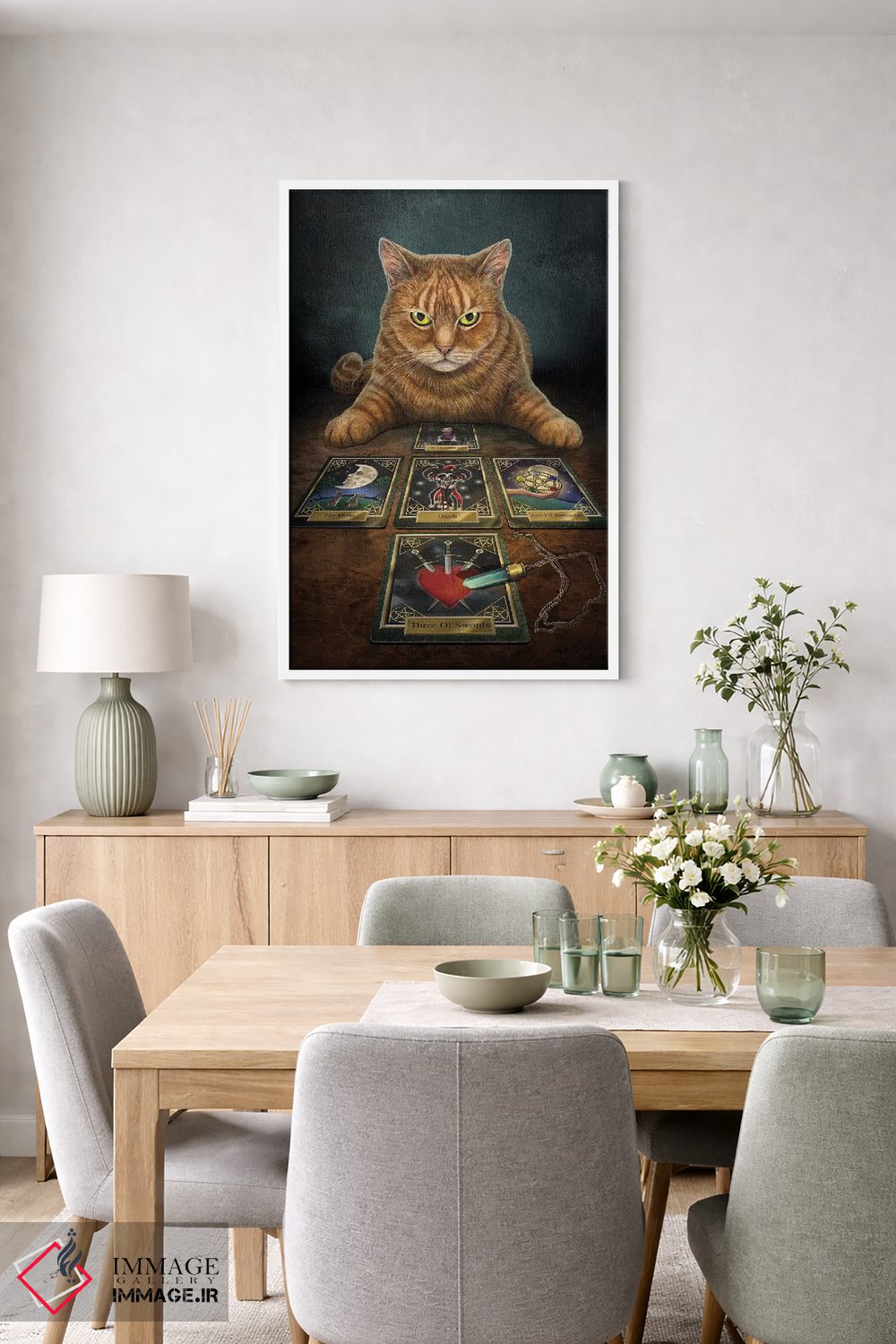 براساس پالت گرم اثر، قاب بلوط روشن (چوبی) پیشنهاد اول است و استخوانی ملایم مکمل. برای سفارشهای پروژهای با ابعاد و قابهای اختصاصی با ایماژ در تماس باشید.