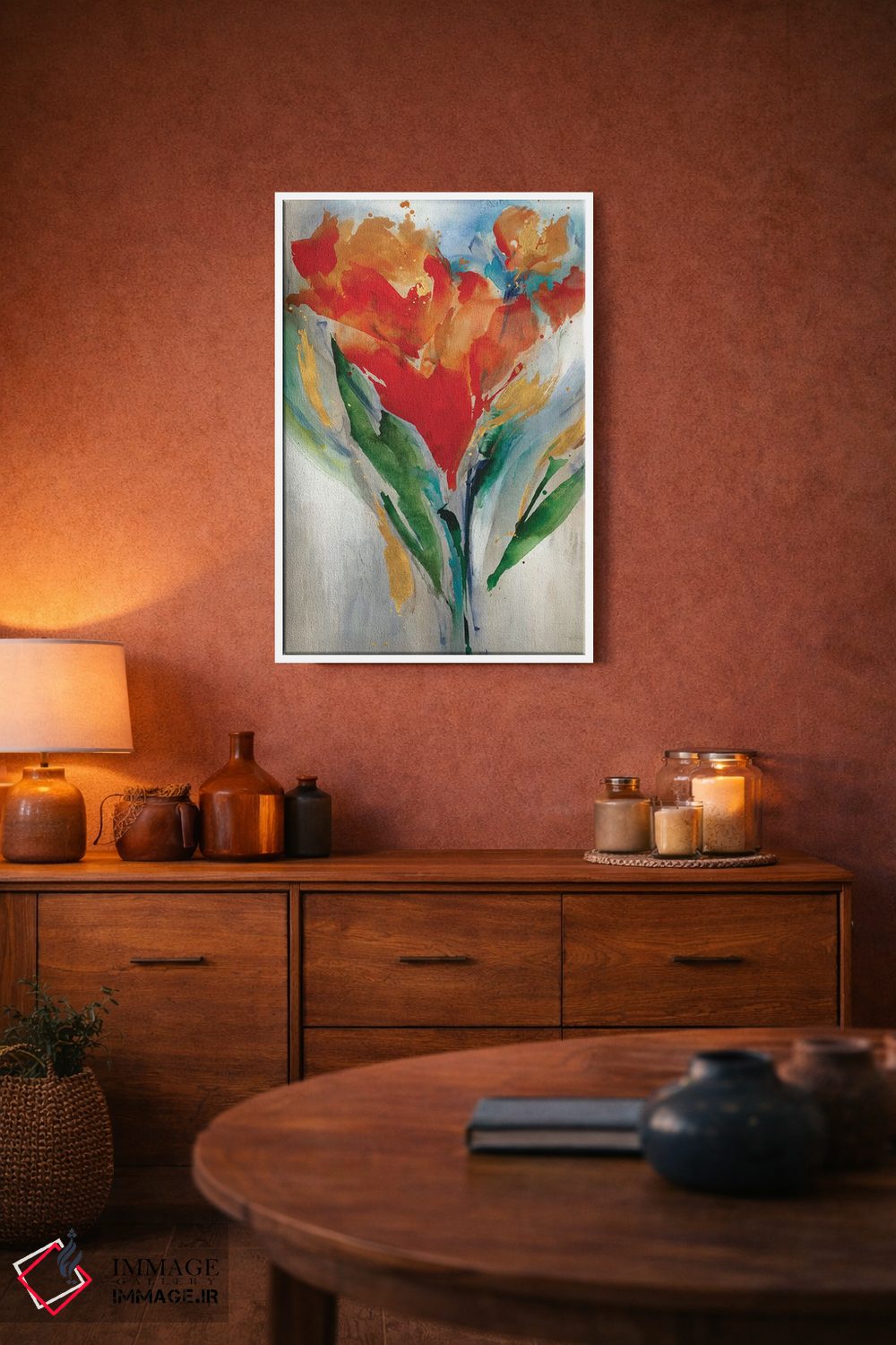 براساس پالت ترکیبی اثر، قاب تیک گرم (چوبی) پیشنهاد اول است و مشکی مات (فریم متوسط) مکمل. برای سفارشهای پروژهای با ابعاد و قابهای اختصاصی با ایماژ در تماس باشید.