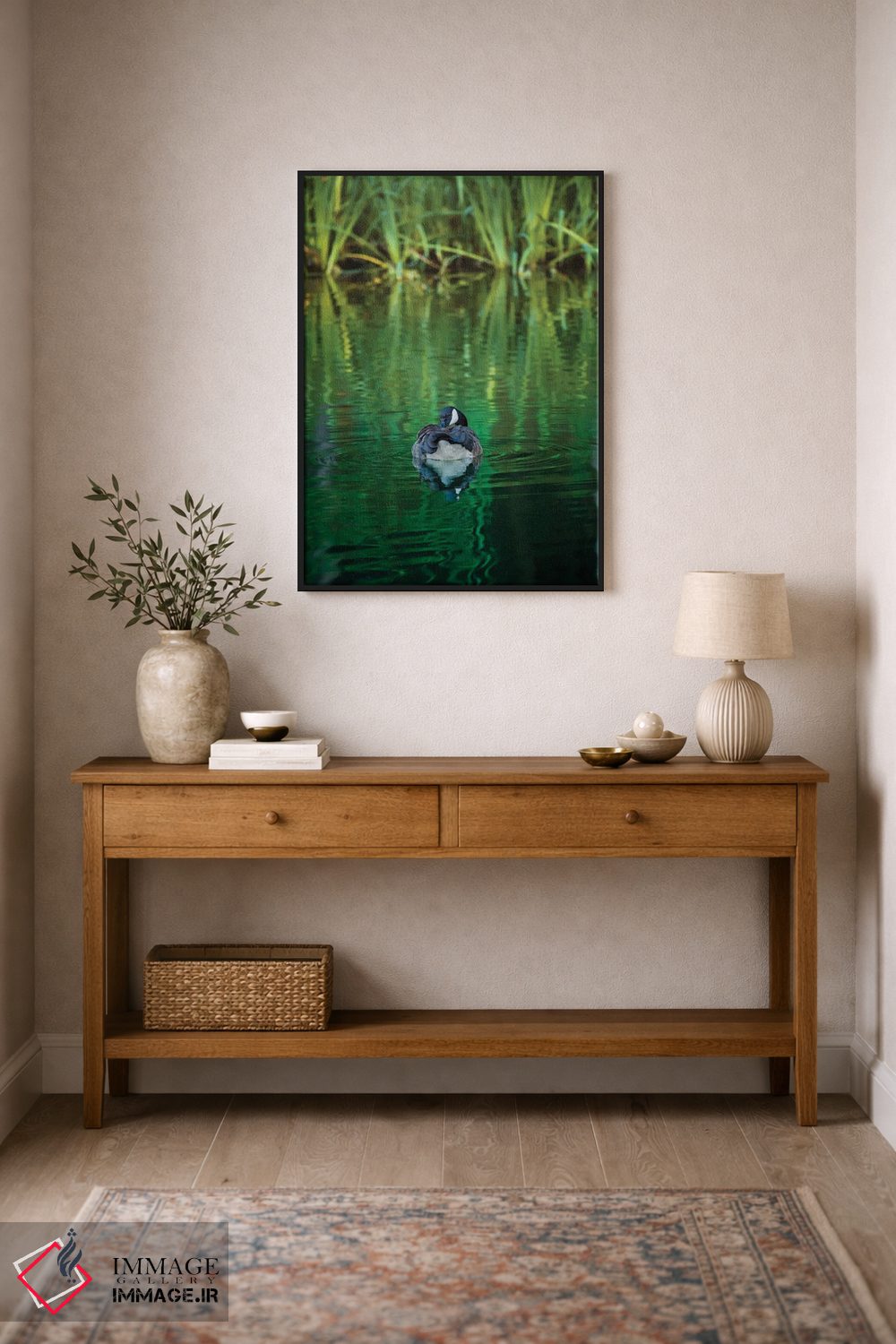 «یک شب زمرباور (در اصل: شنای شبانه کورموران)» اثرِ «لوئیس راث» میتواند به دیوار، انرژیِ نرم و زنده بدهد؛ برای راهروها و ورودیهای گرم پیشنهاد میشود. در کنار گیاهان و نور طبیعی، جذابتر هم میشود.
