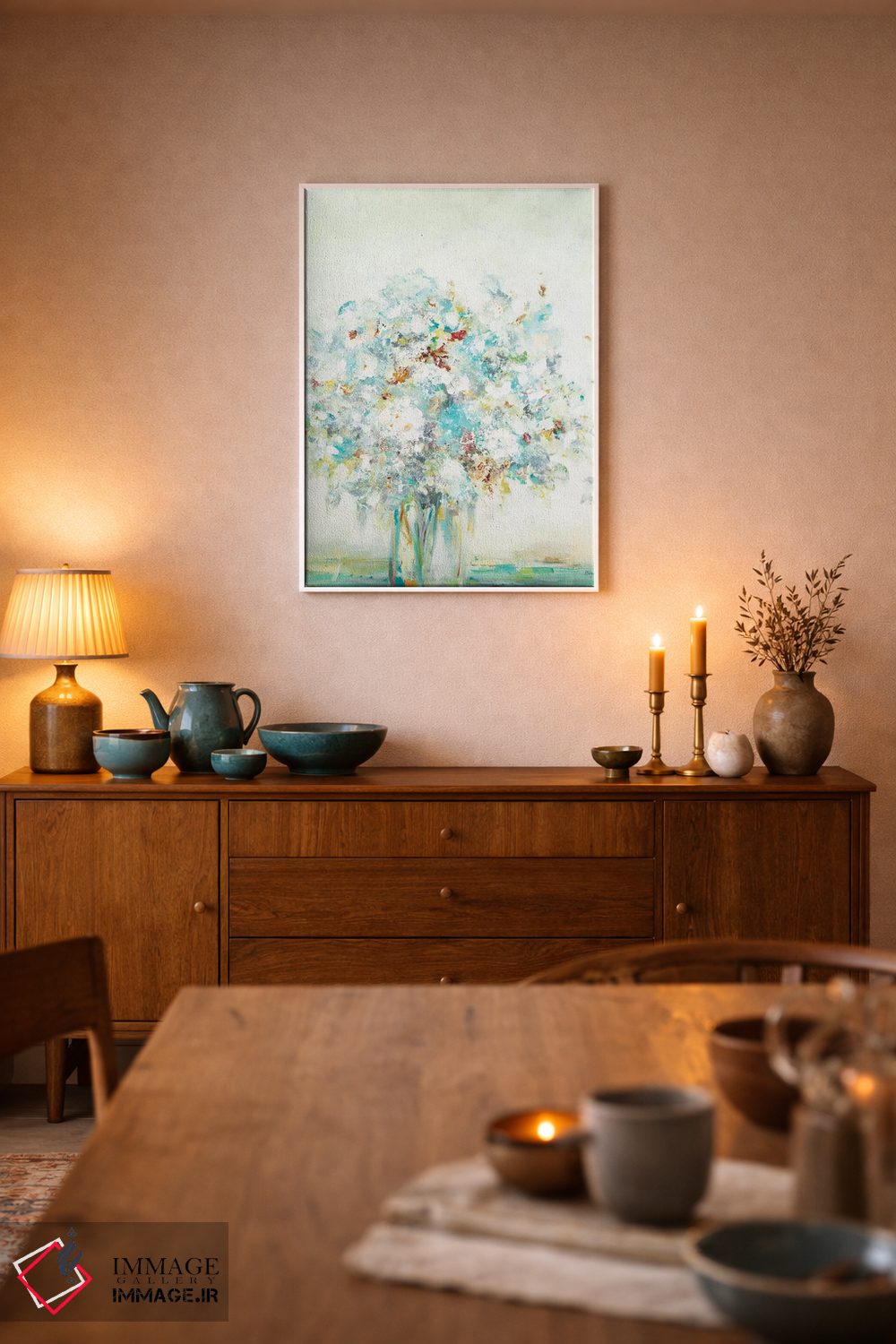 براساس پالت سرد اثر، قاب بلوط روشن (چوبی) پیشنهاد اول است و استخوانی ملایم مکمل. برای سفارشهای پروژهای با ابعاد و قابهای اختصاصی با ایماژ در تماس باشید.