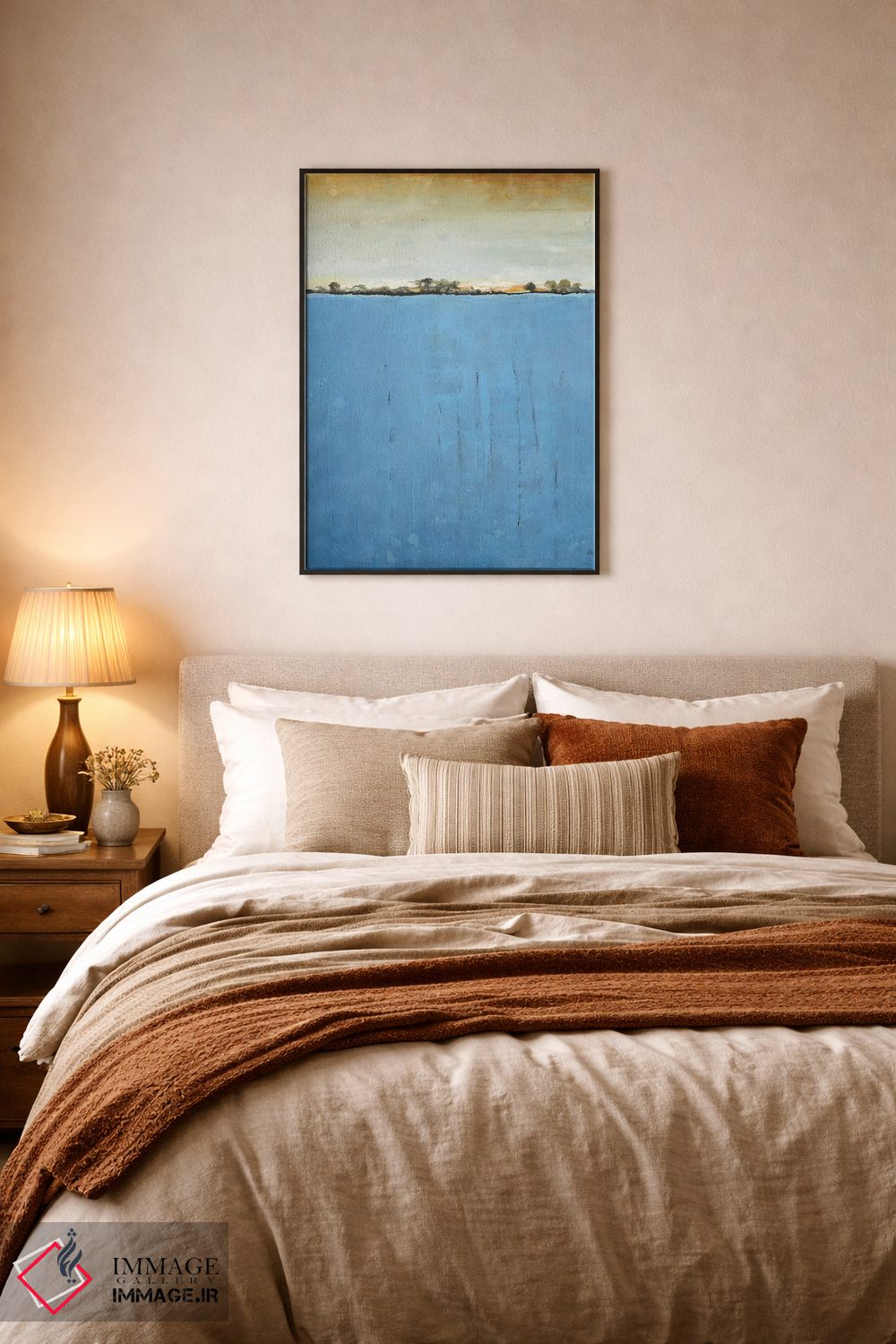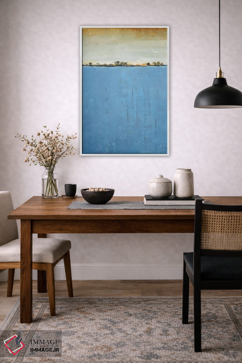 براساس پالت ترکیبی اثر، قاب بلوط روشن (چوبی) پیشنهاد اول است و استخوانی ملایم مکمل. برای سفارشهای پروژهای با ابعاد و قابهای اختصاصی با ایماژ در تماس باشید.