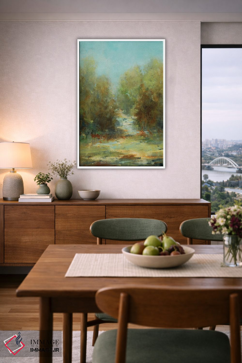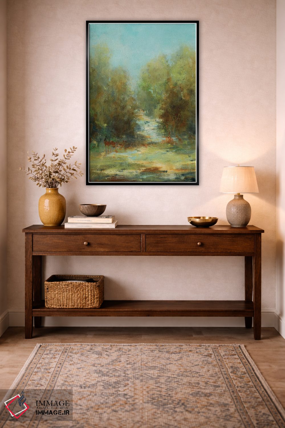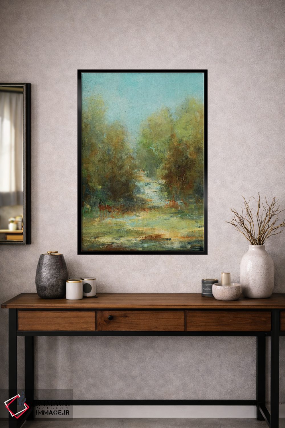 براساس پالت ترکیبی اثر، قاب تیک گرم (چوبی) پیشنهاد اول است و مشکی مات (فریم متوسط) مکمل. برای سفارشهای پروژهای با ابعاد و قابهای اختصاصی با ایماژ در تماس باشید.