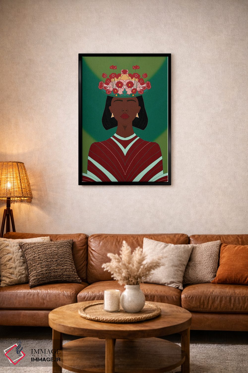 براساس پالت ترکیبی اثر، قاب تیک گرم (چوبی) پیشنهاد اول است و مشکی مات (فریم متوسط) مکمل. برای سفارشهای پروژهای با ابعاد و قابهای اختصاصی با ایماژ در تماس باشید.
