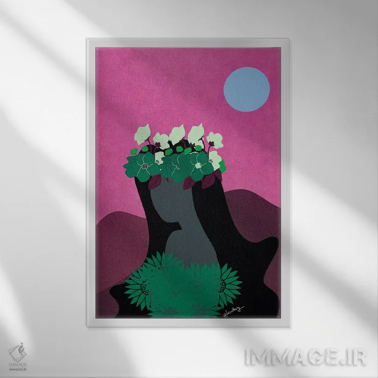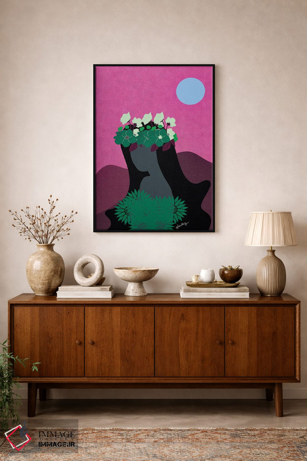 براساس پالت ترکیبی اثر، قاب تیک گرم (چوبی) پیشنهاد اول است و مشکی مات (فریم متوسط) مکمل. برای سفارشهای پروژهای با ابعاد و قابهای اختصاصی با ایماژ در تماس باشید.