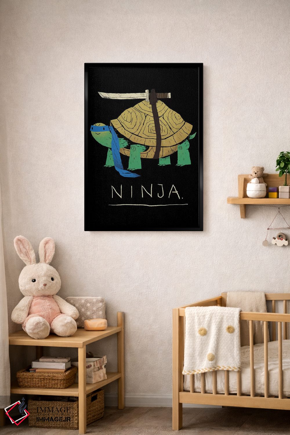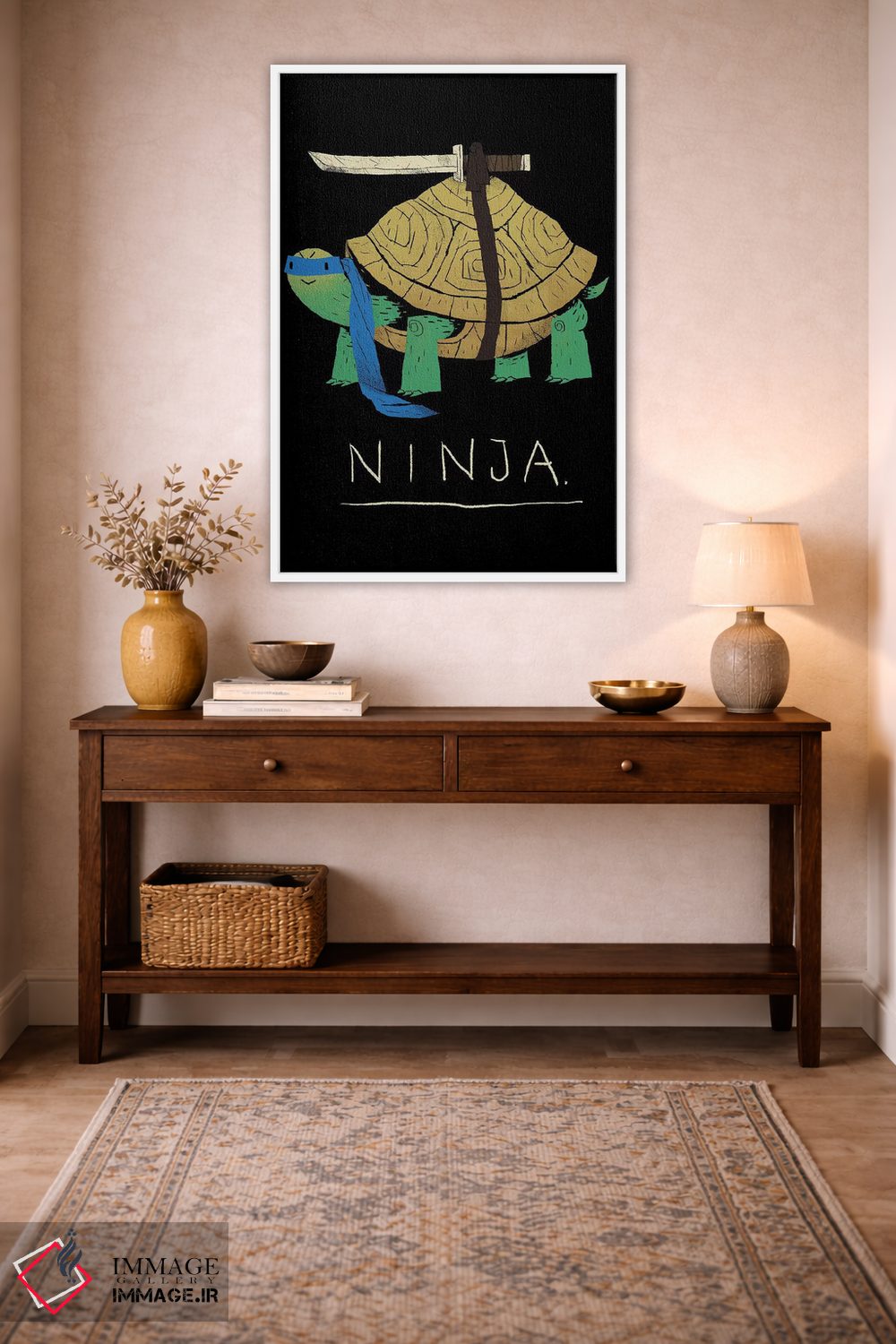 در «نینجای آبی» اثرِ «لوئیس روسکوش»، رنگها و فرمها یادآور پوسترهای قدیمیاند؛ انتخابی جذاب برای کافهاستایل و دکورهای شهری.