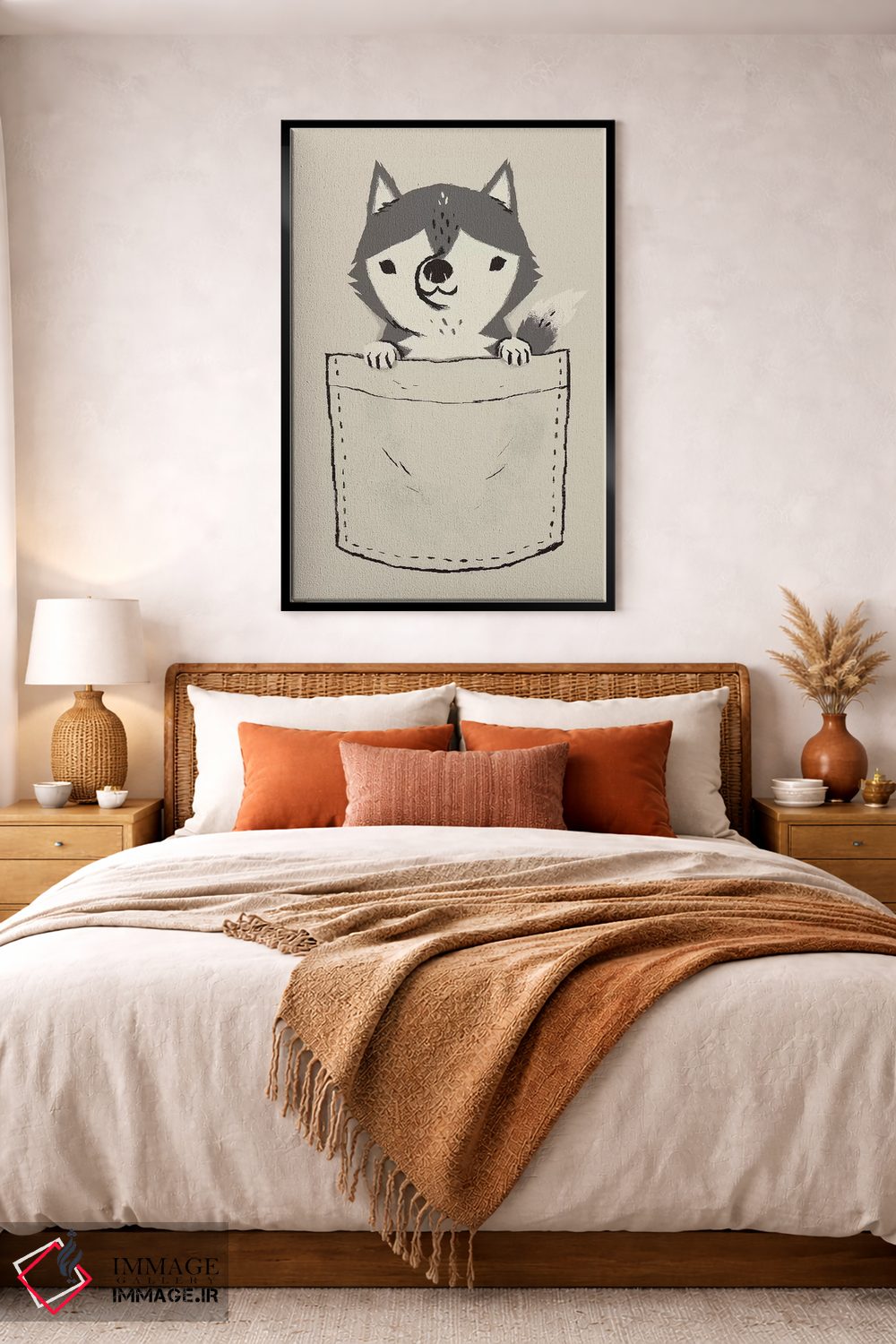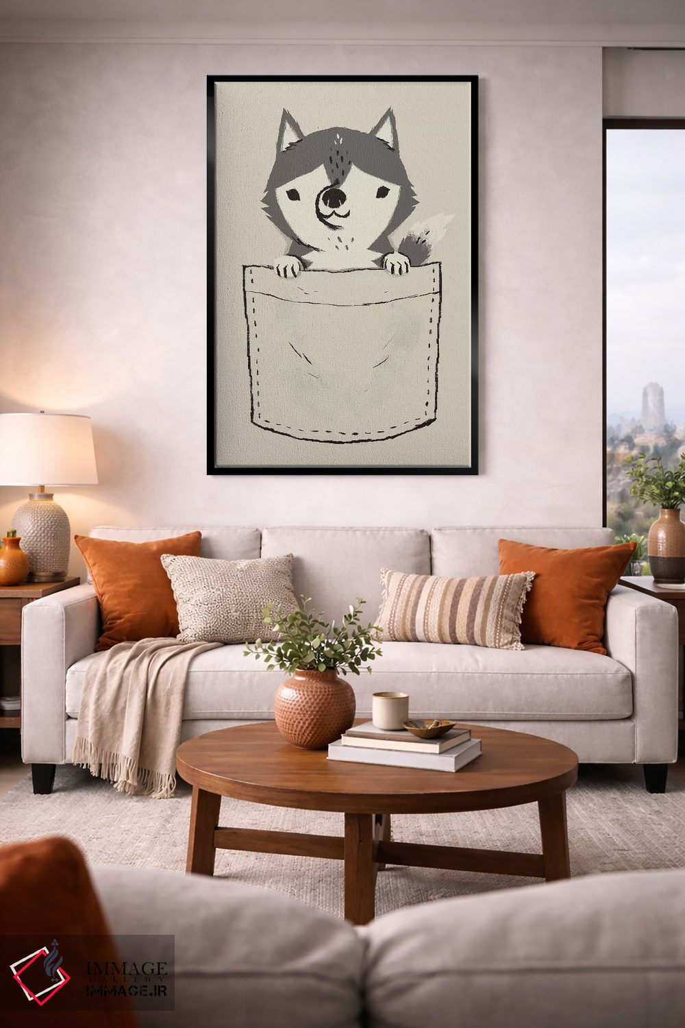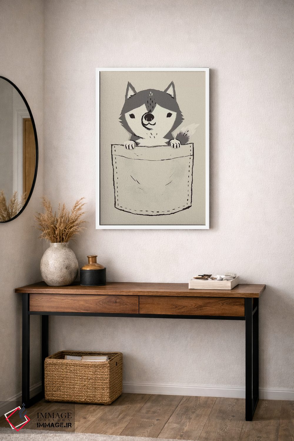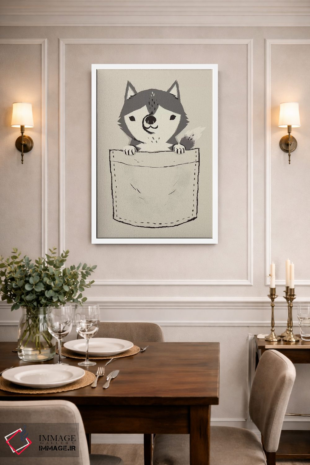 اگر به آثار حیوانات علاقه دارید، «هاسکی جیبی» اثرِ «لوئیس روسکوش» در کنار رنگهای خنثی، تضاد دلچسبی میسازد، برای دکورهای مدرن و مینیمال گزینهٔ مناسبیست. هم فضا را گرم میکند، هم شلوغش نمیکند.
