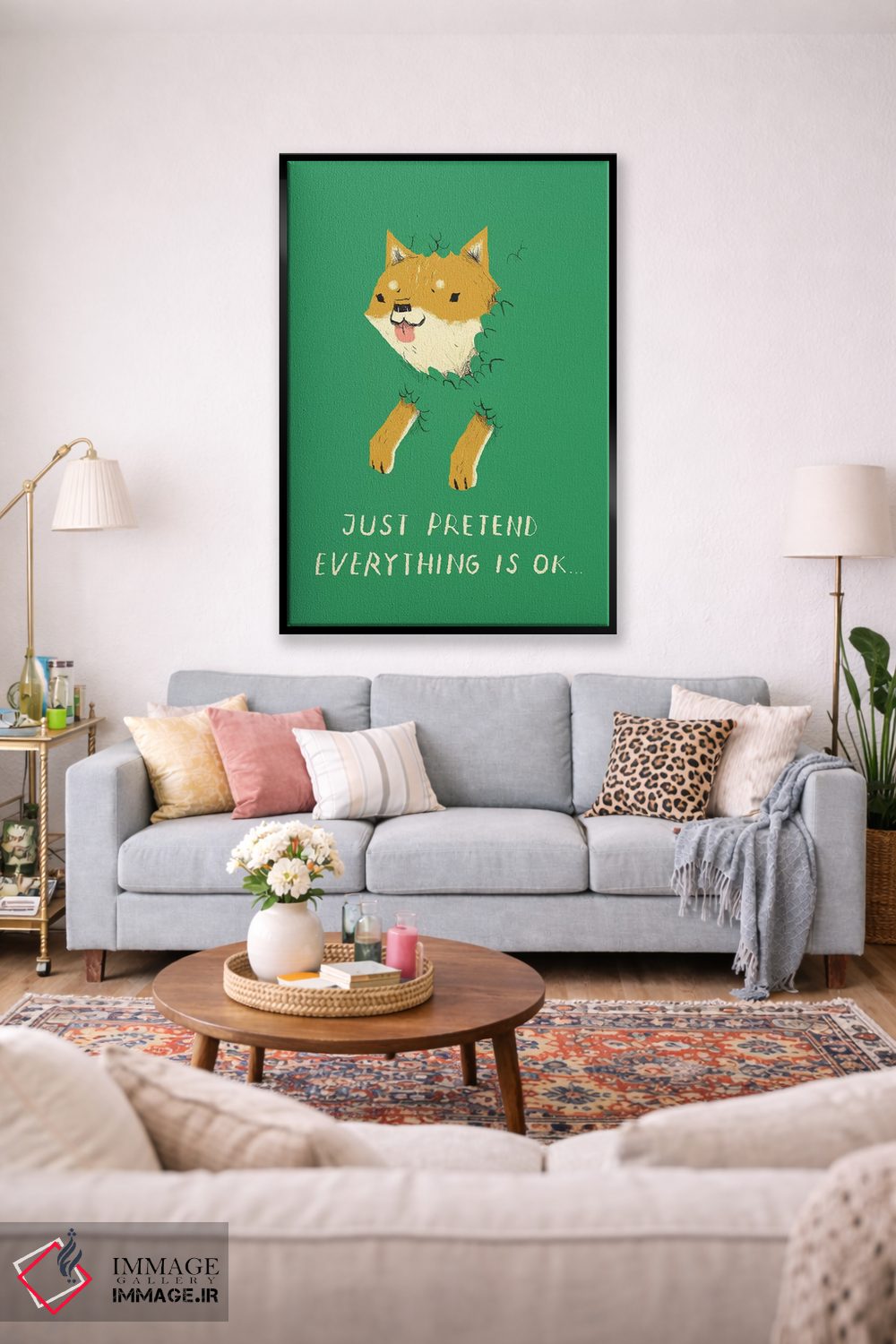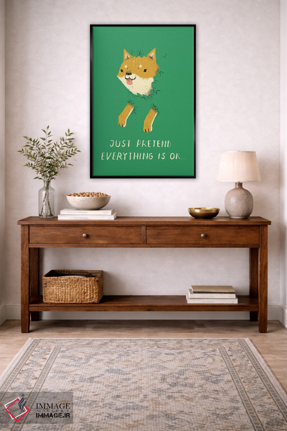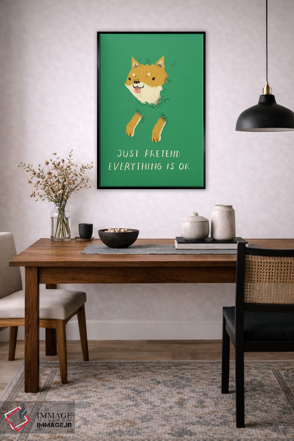 برای دکورهای صمیمی، «سگ بوش (اشاره به میم doge)» اثرِ «لوئیس روسکوش» در کنار رنگهای خنثی، تضاد دلچسبی میسازد؛ برای خانههایی با چوب و پارچههای گرم انتخابی خوشسلیقه است. هم فضا را گرم میکند، هم شلوغش نمیکند.