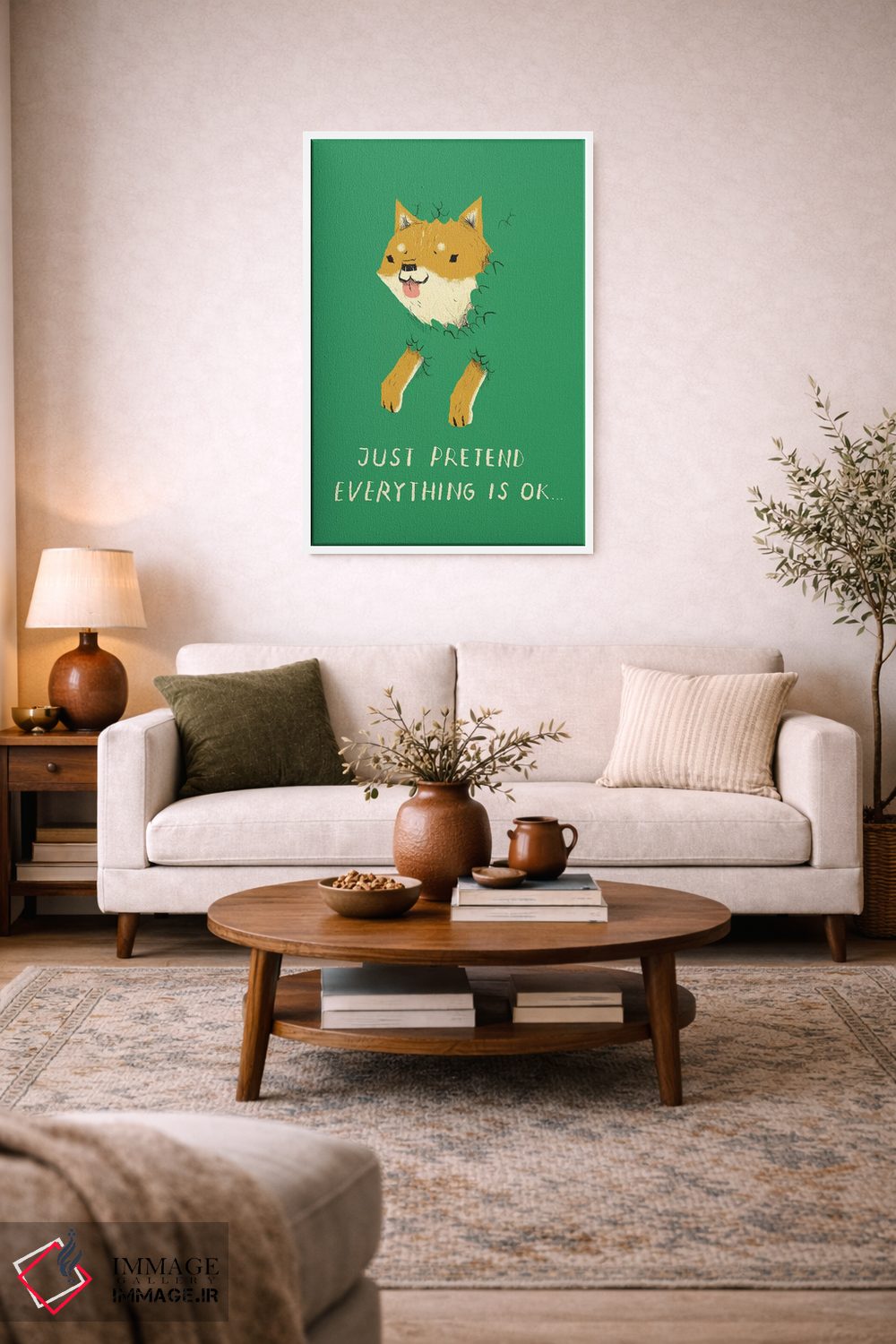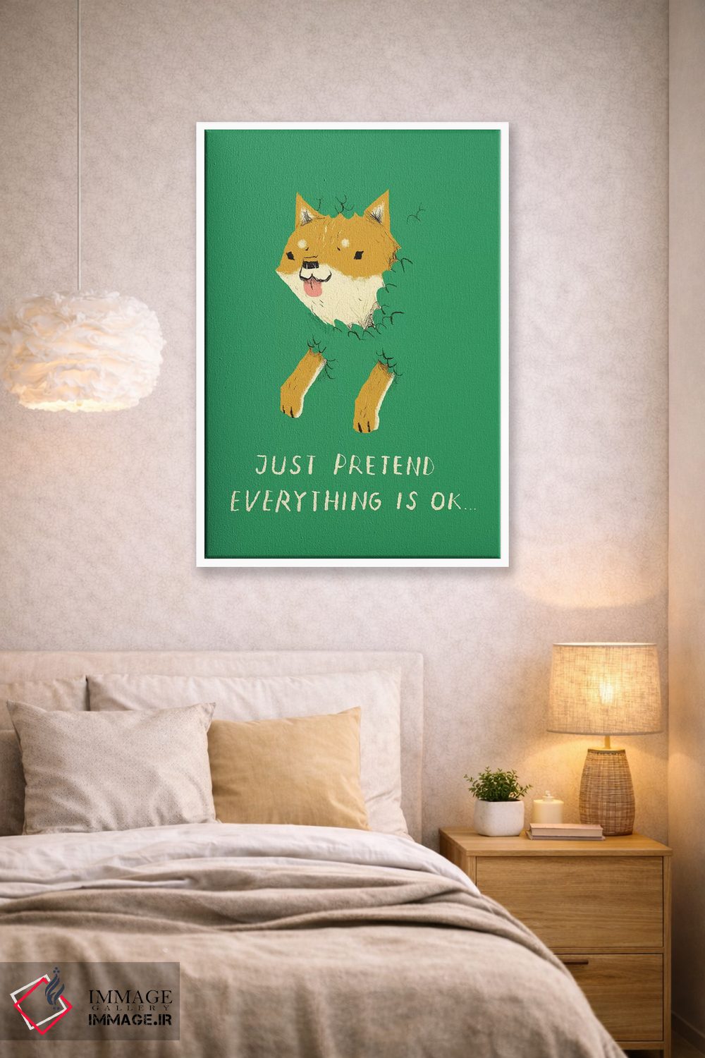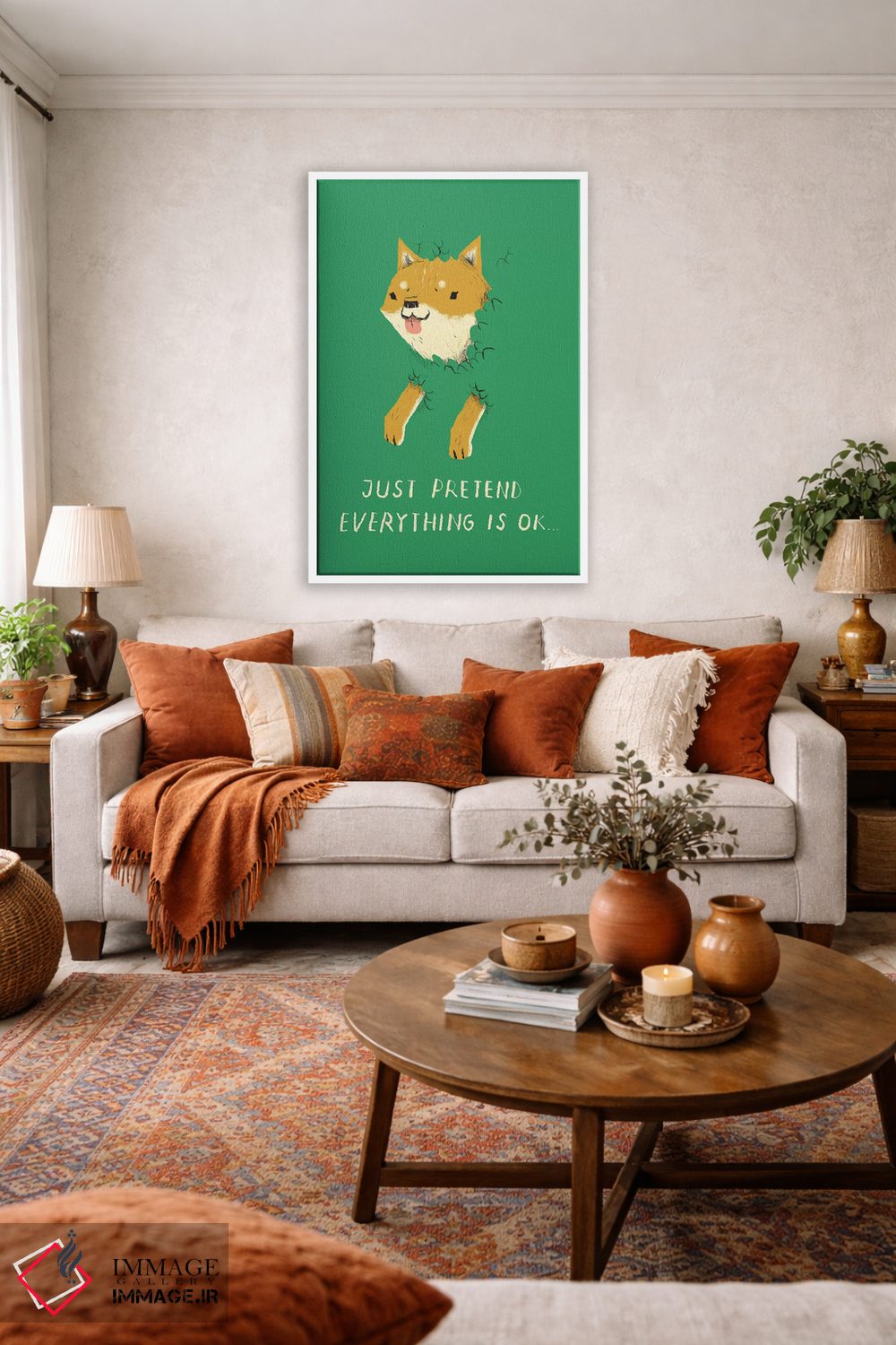 برای دکورهای صمیمی، «سگ بوش (اشاره به میم doge)» اثرِ «لوئیس روسکوش» در کنار رنگهای خنثی، تضاد دلچسبی میسازد؛ برای خانههایی با چوب و پارچههای گرم انتخابی خوشسلیقه است. هم فضا را گرم میکند، هم شلوغش نمیکند.