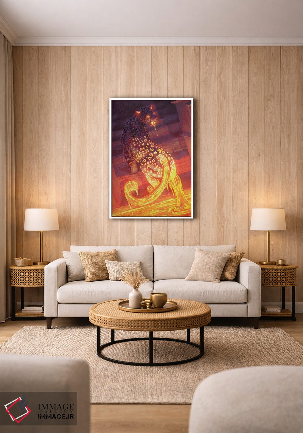 براساس پالت ترکیبی اثر، قاب تیک گرم (چوبی) پیشنهاد اول است و مشکی مات (فریم متوسط) مکمل. برای سفارشهای پروژهای با ابعاد و قابهای اختصاصی با ایماژ در تماس باشید.