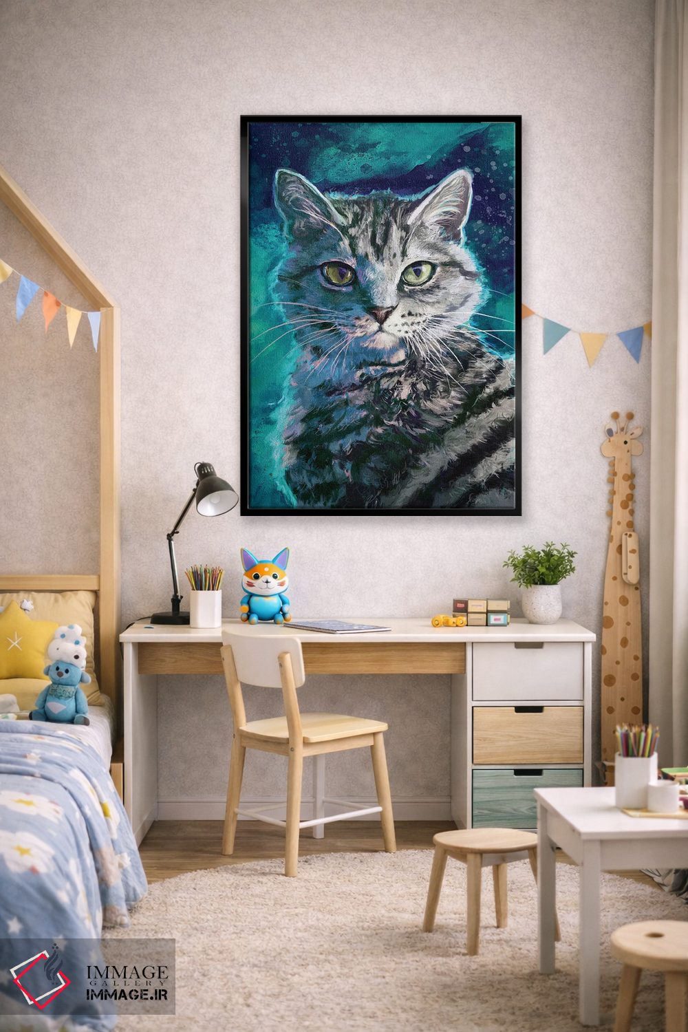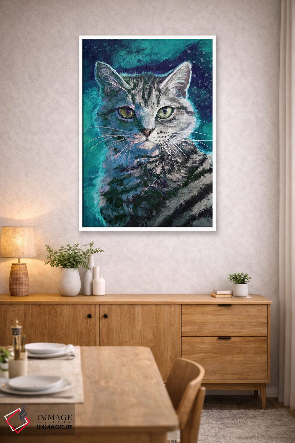 برای دیوارهای ساده، «گربه خطدار نقرهای» اثرِ «لوییز گلبی» به فضا، گرمیِ ملایم اضافه میکند؛ برای دکورهای مدرن و مینیمال انتخابی خوشسلیقه است. هر بار نگاهش میکنید، یک جزئیات تازه به چشم میآید.