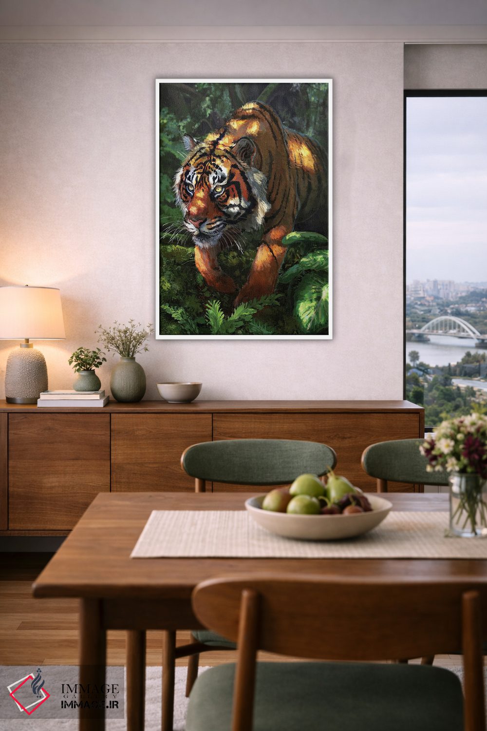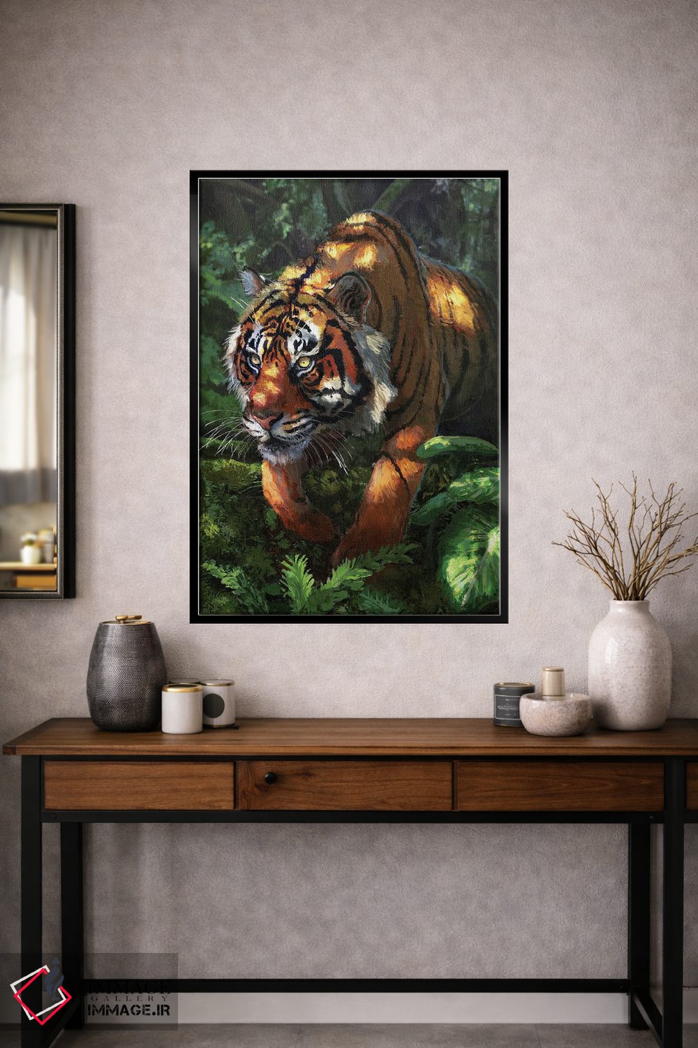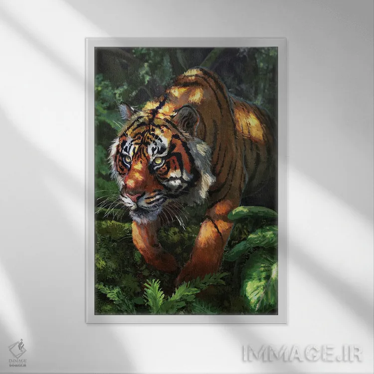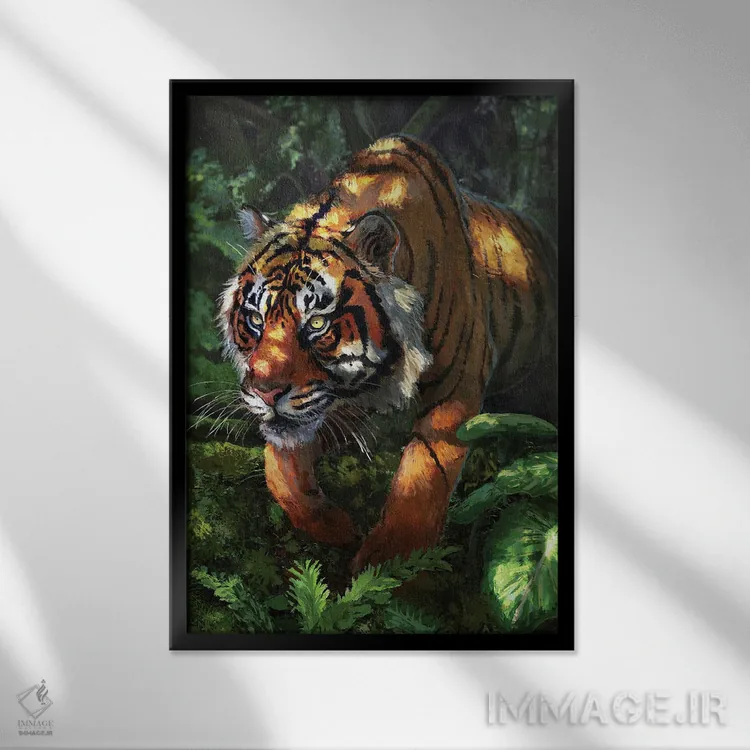 براساس پالت ترکیبی اثر، قاب تیک گرم (چوبی) پیشنهاد اول است و مشکی مات (فریم متوسط) مکمل. برای سفارشهای پروژهای با ابعاد و قابهای اختصاصی با ایماژ در تماس باشید.