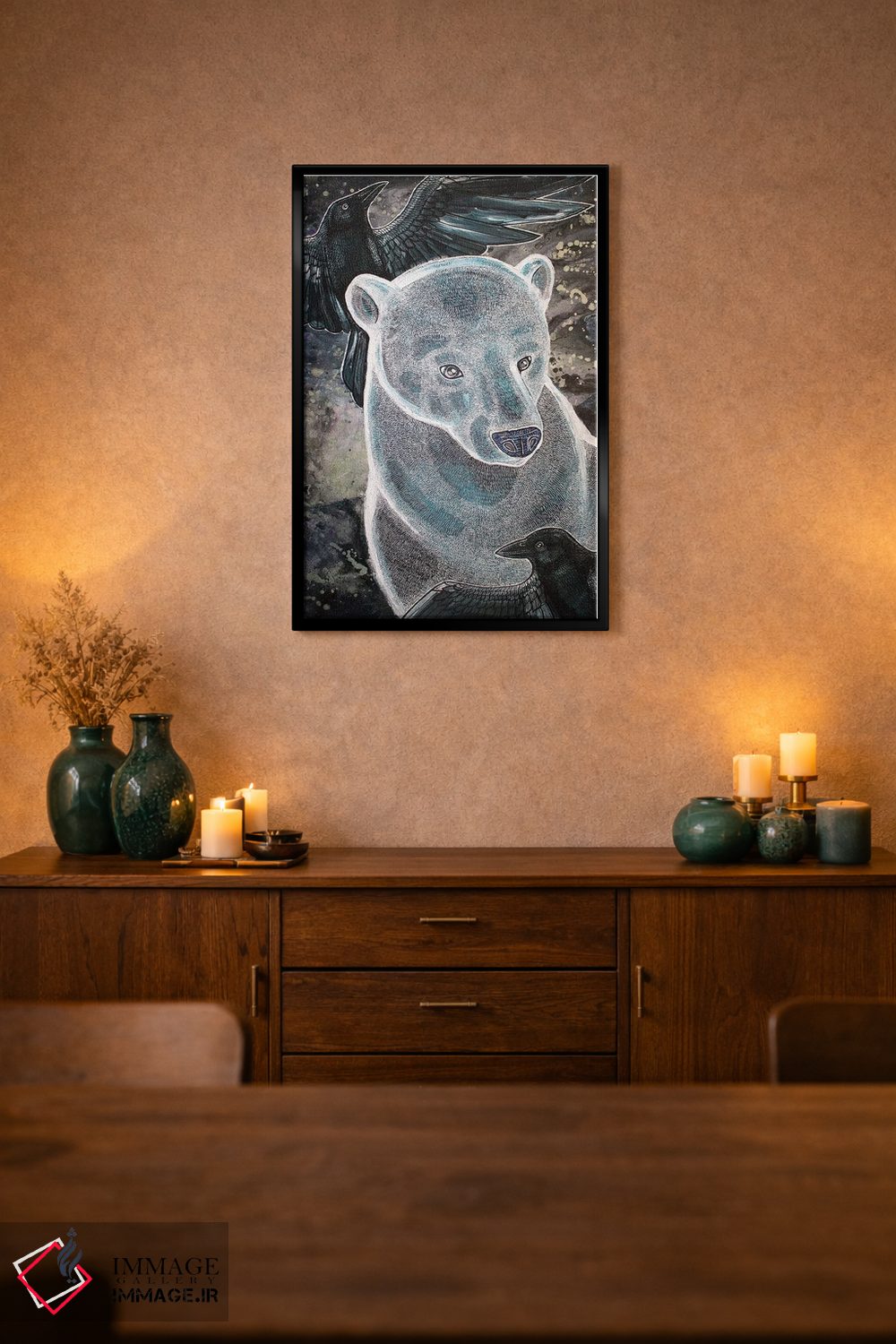 براساس پالت گرم اثر، قاب بلوط روشن (چوبی) پیشنهاد اول است و استخوانی ملایم مکمل. برای سفارشهای پروژهای با ابعاد و قابهای اختصاصی با ایماژ در تماس باشید.
