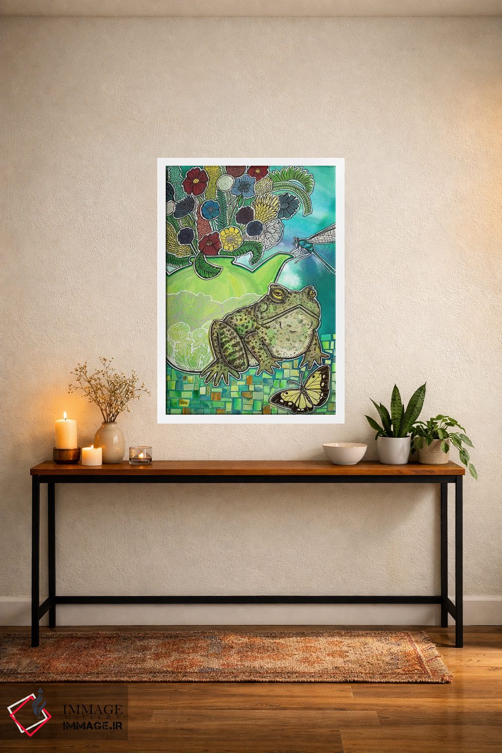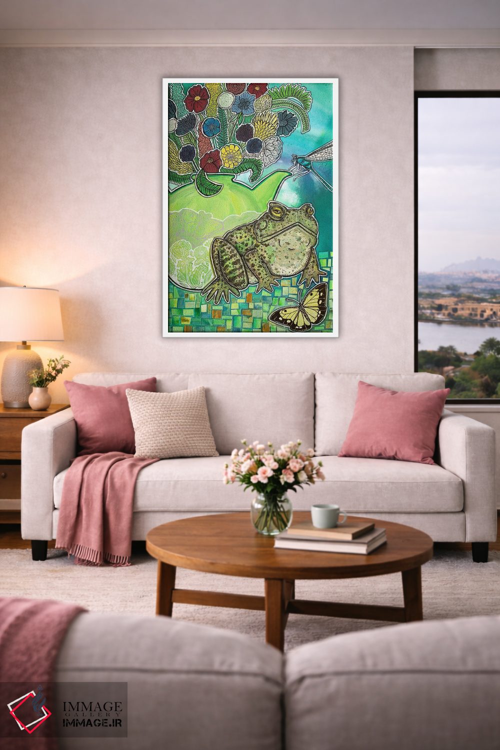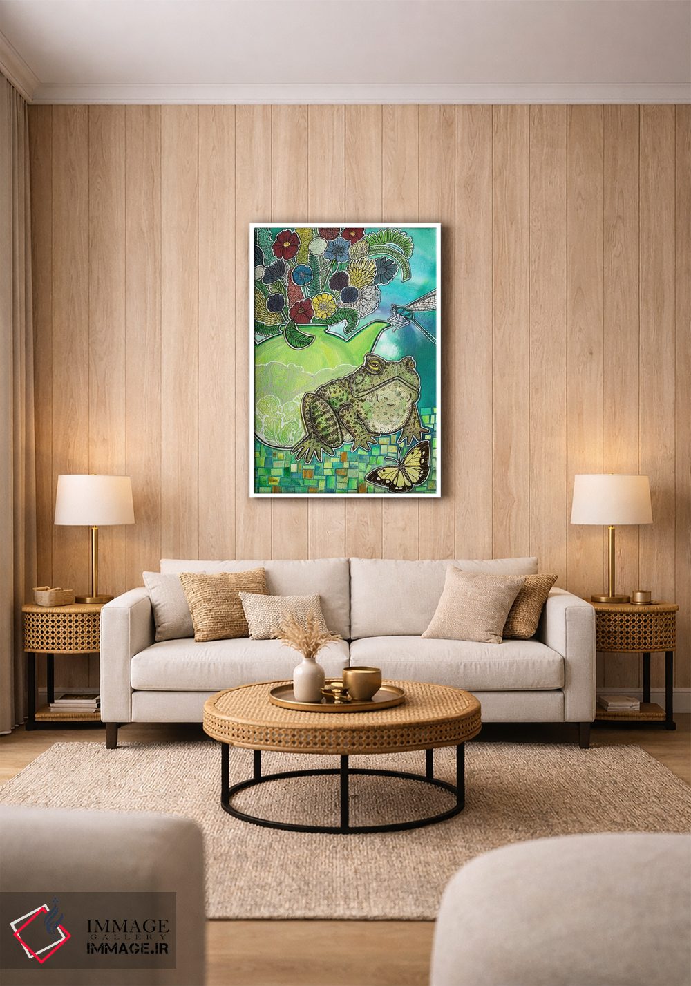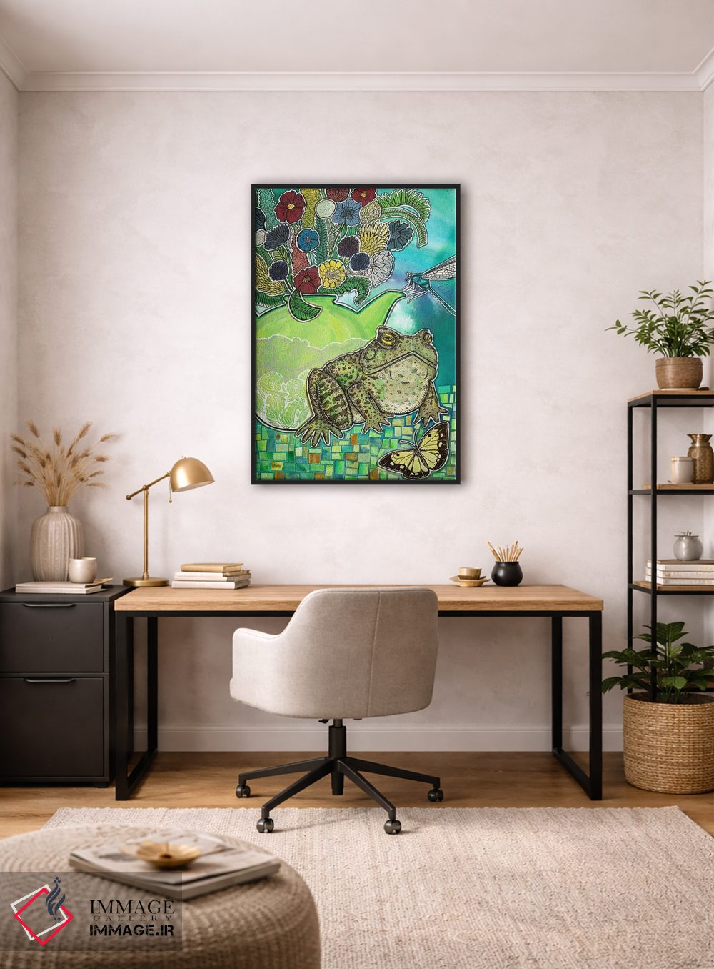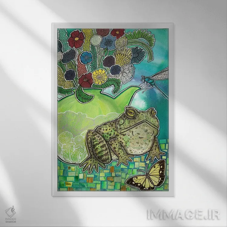 براساس پالت ترکیبی اثر، قاب تیک گرم (چوبی) پیشنهاد اول است و مشکی مات (فریم متوسط) مکمل. برای سفارشهای پروژهای با ابعاد و قابهای اختصاصی با ایماژ در تماس باشید.