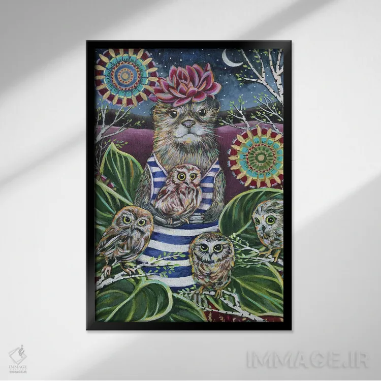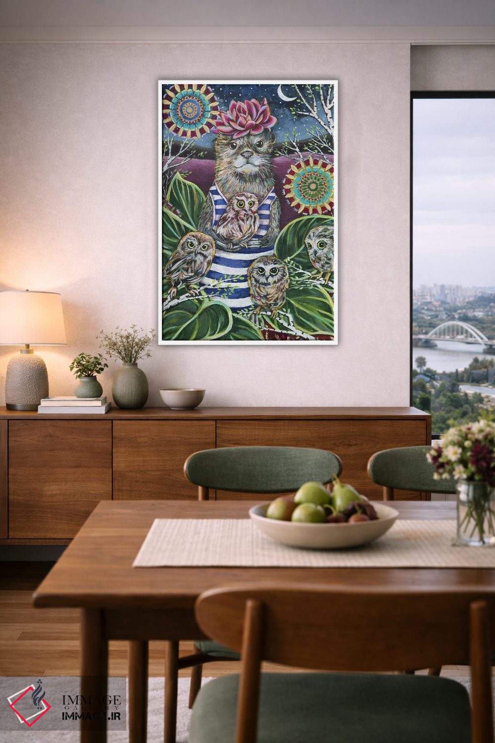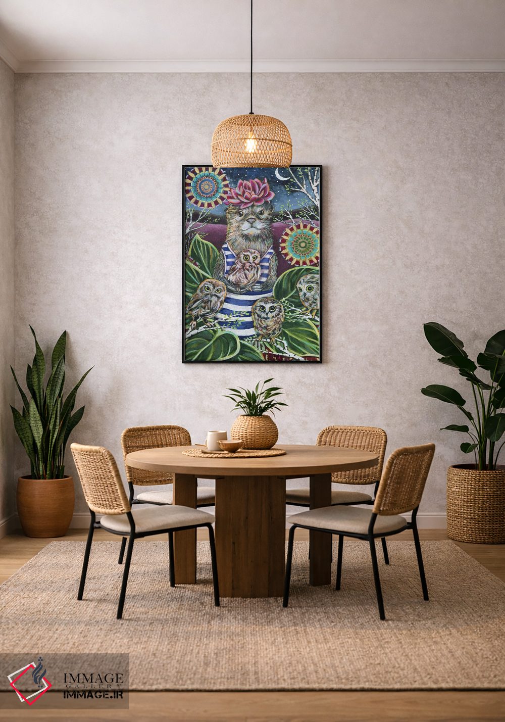 براساس پالت ترکیبی اثر، قاب تیک گرم (چوبی) پیشنهاد اول است و مشکی مات (فریم متوسط) مکمل. برای سفارشهای پروژهای با ابعاد و قابهای اختصاصی با ایماژ در تماس باشید.