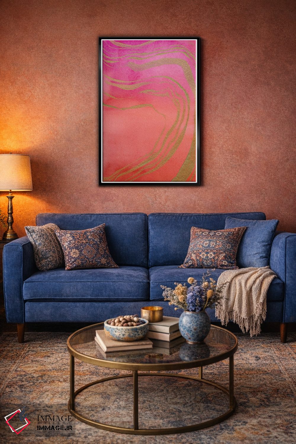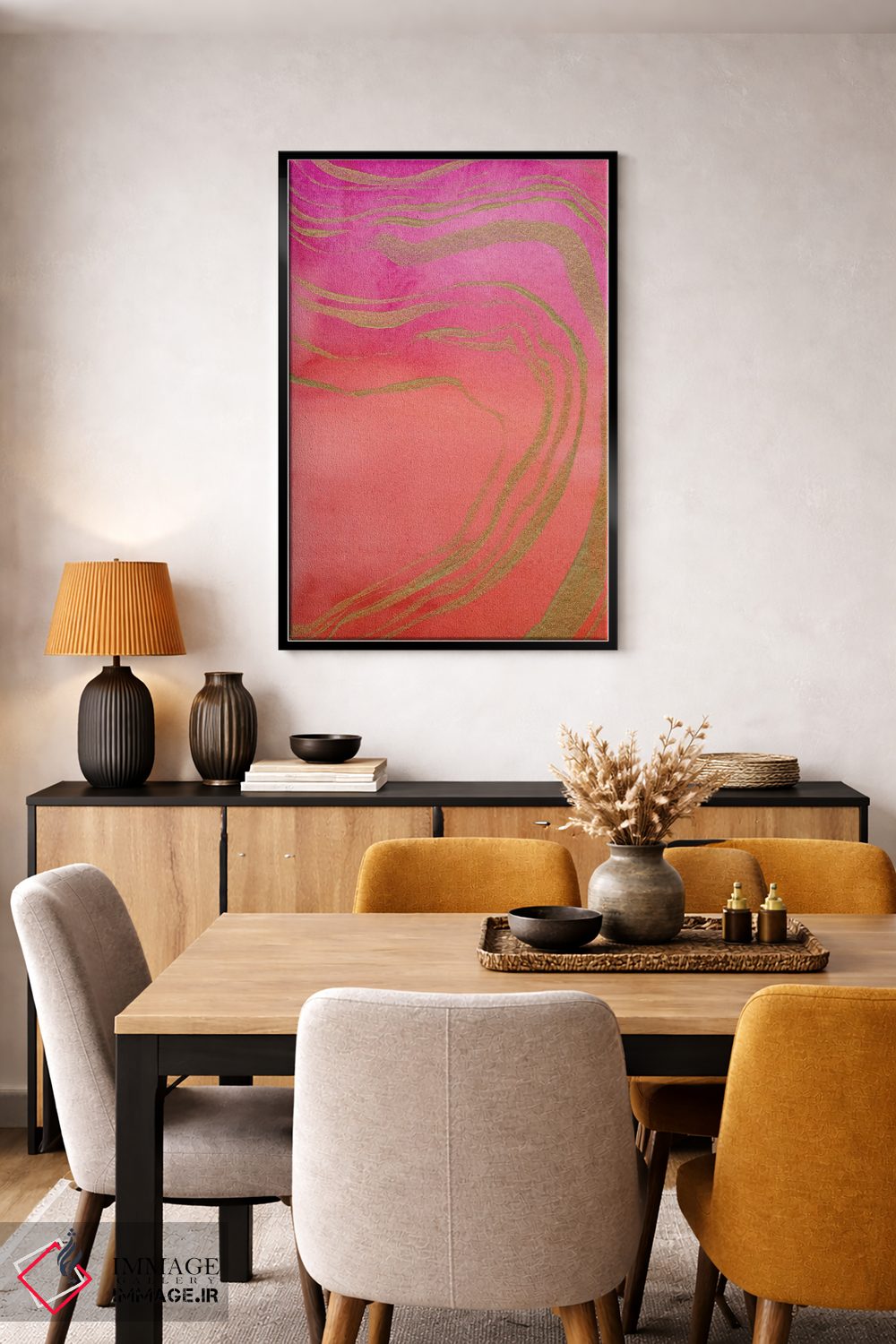 براساس پالت گرم اثر، قاب تیک گرم (چوبی) پیشنهاد اول است و مشکی مات (فریم متوسط) مکمل. برای سفارشهای پروژهای با ابعاد و قابهای اختصاصی با ایماژ در تماس باشید.