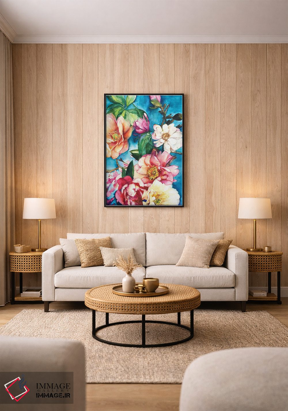 براساس پالت ترکیبی اثر، قاب تیک گرم (چوبی) پیشنهاد اول است و مشکی مات (فریم متوسط) مکمل. برای سفارشهای پروژهای با ابعاد و قابهای اختصاصی با ایماژ در تماس باشید.