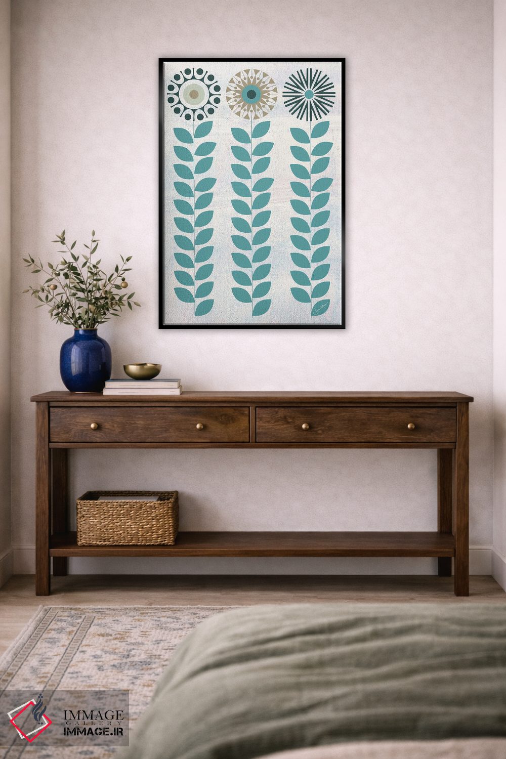برای دیواری که میخواهید نرمتر دیده شود، «شکوفه (آبی)» اثرِ «لولوآرتاستودیو (استودیو هنری)» حس طراوت را بدون شلوغی وارد اتاق میکند؛ برای فضاهای بوهمی انتخابی خوشسلیقه است. فضا را شلوغ نمیکند؛ فقط لطیفترش میکند.