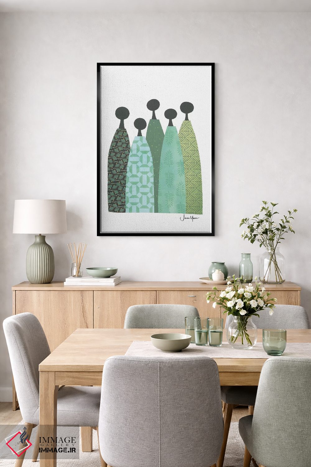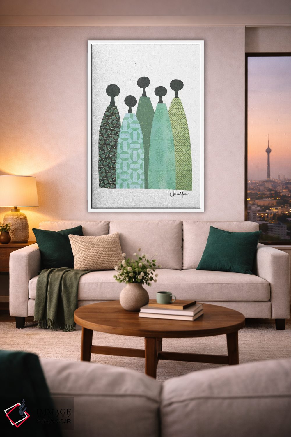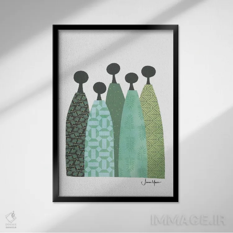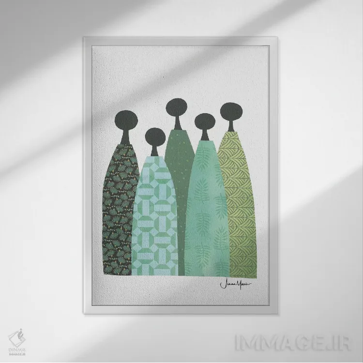 «پنج زن خردمند با لباس سبز» اثرِ «لولوآرتاستودیو (استودیو هنری)» یک پیشنهاد حرفهای برای اتاق کار یا نشیمنهای مدرن است؛ چون هم انرژی دارد هم کنترلشده است.
