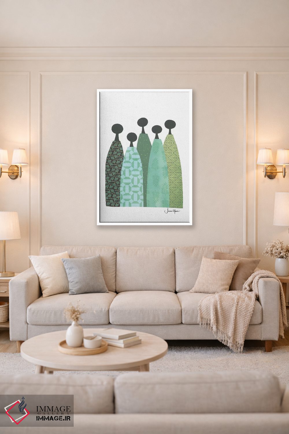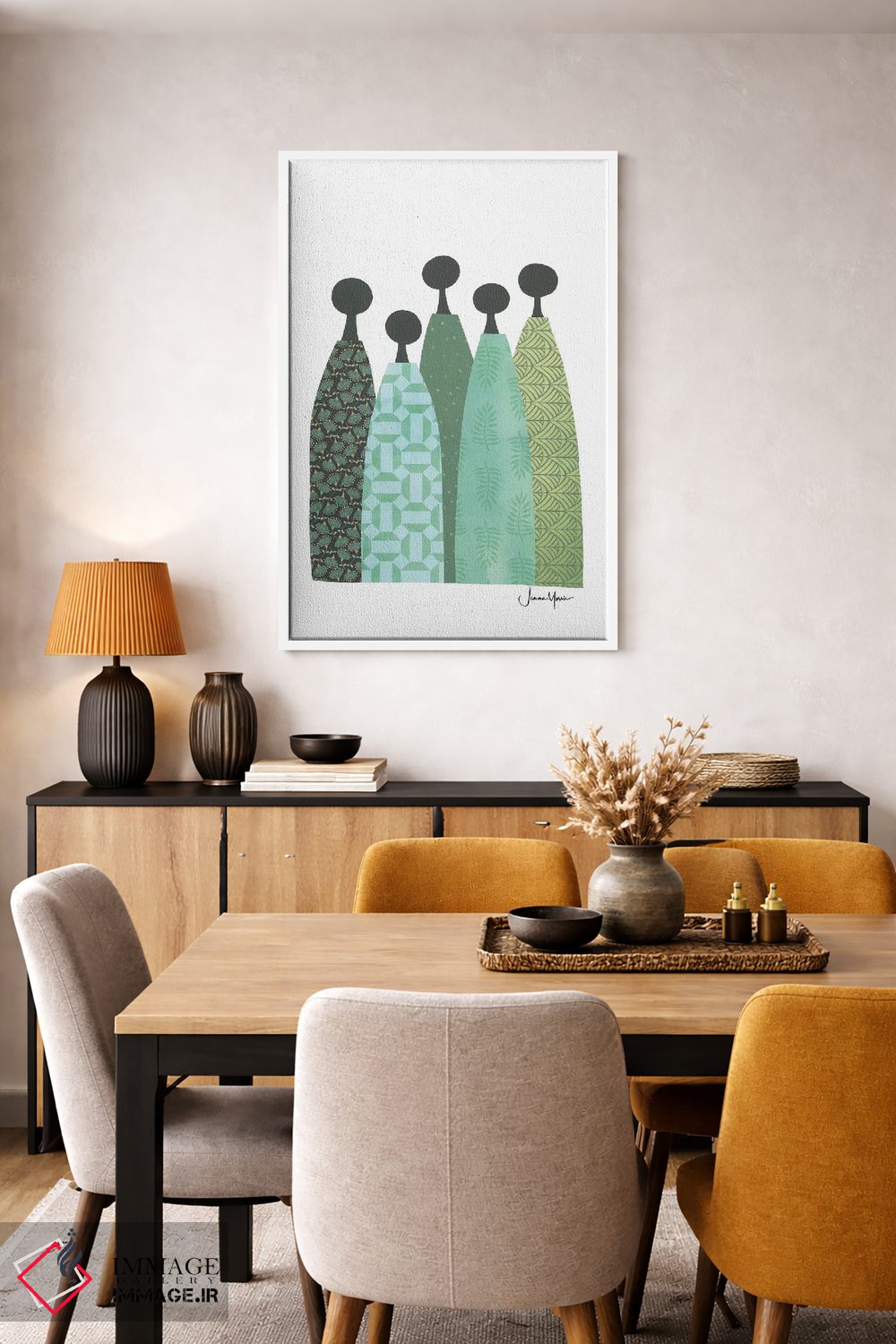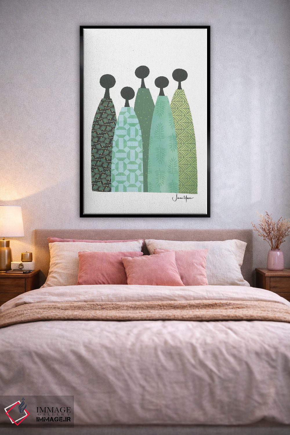 «پنج زن خردمند با لباس سبز» اثرِ «لولوآرتاستودیو (استودیو هنری)» یک پیشنهاد حرفهای برای اتاق کار یا نشیمنهای مدرن است؛ چون هم انرژی دارد هم کنترلشده است.
