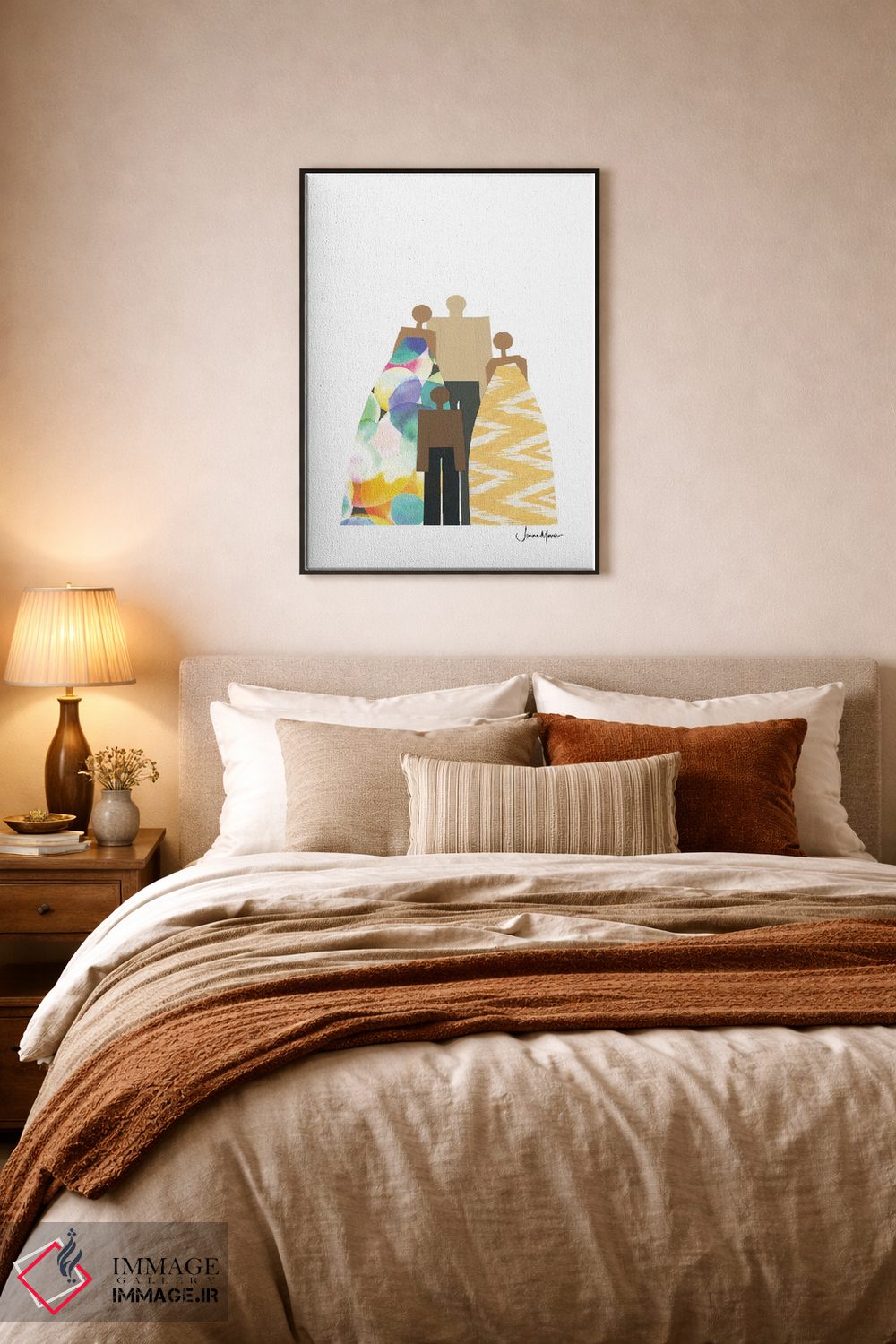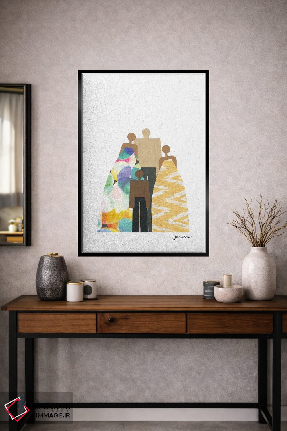 براساس پالت ترکیبی اثر، قاب تیک گرم (چوبی) پیشنهاد اول است و مشکی مات (فریم متوسط) مکمل. برای سفارشهای پروژهای با ابعاد و قابهای اختصاصی با ایماژ در تماس باشید.