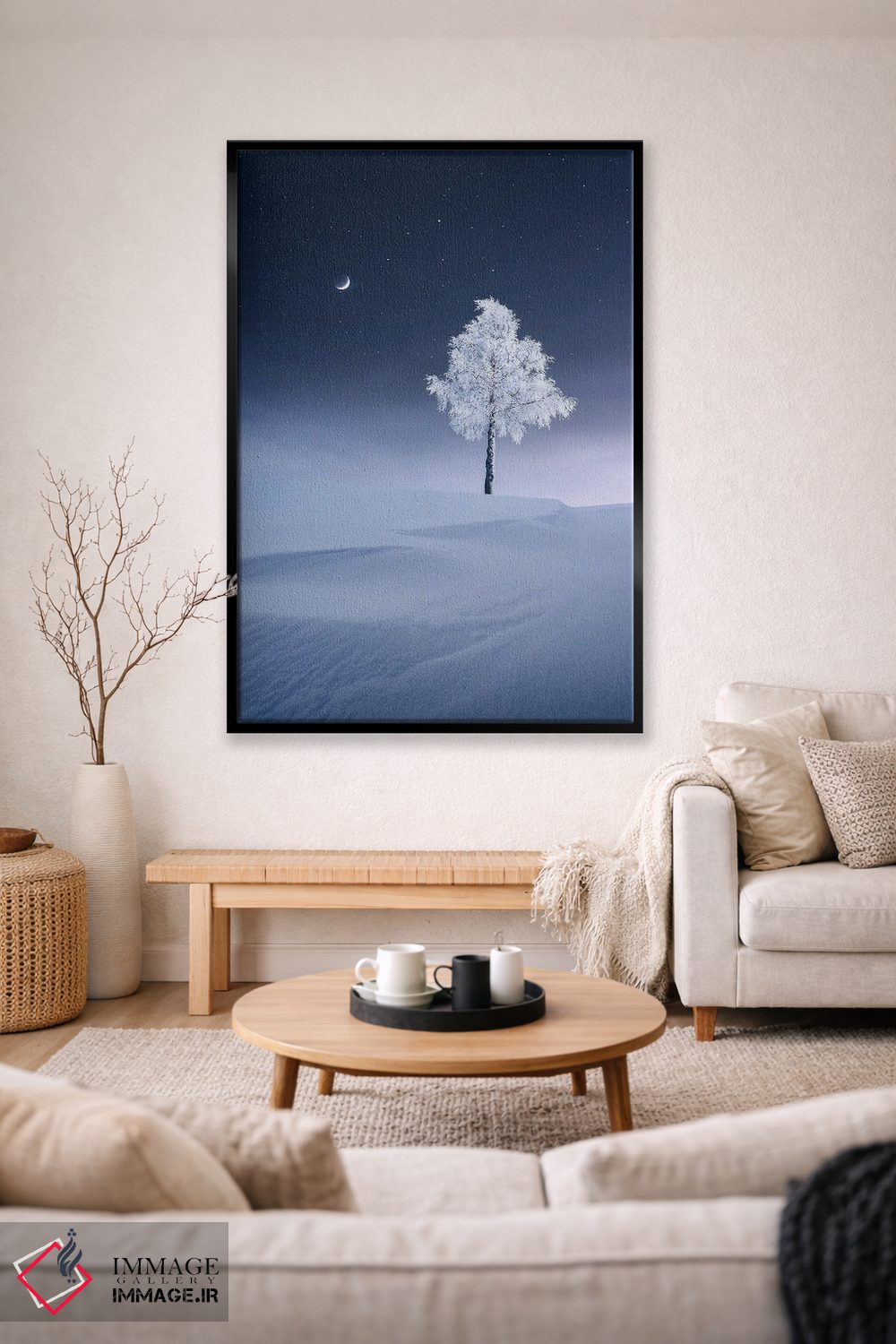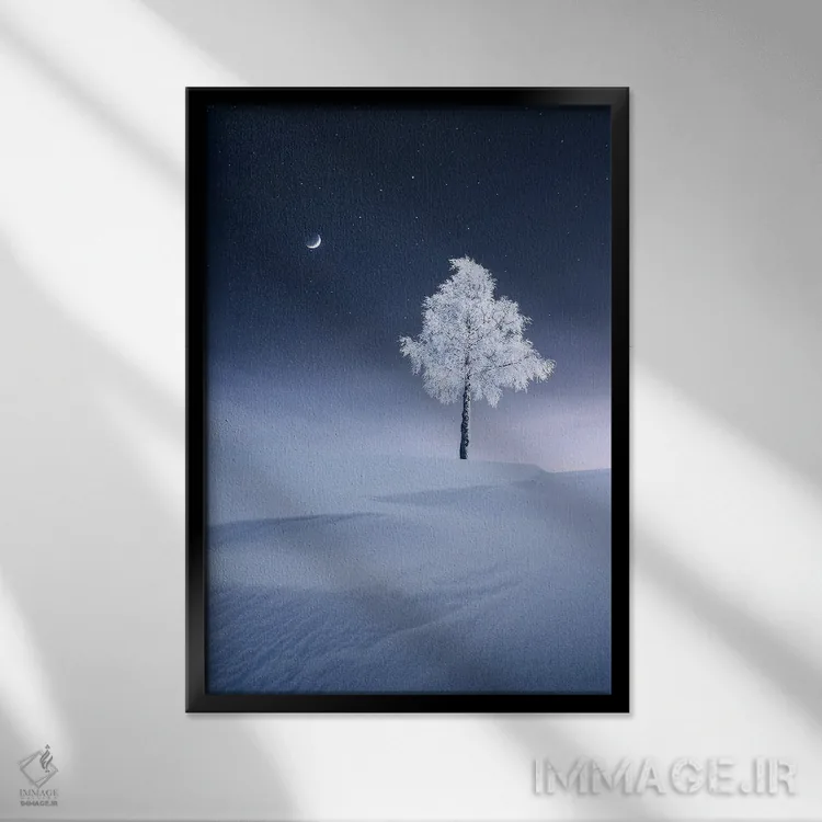 براساس پالت سرد اثر، قاب سفید مات (فریم باریک) پیشنهاد اول است و نقرهای برسخورده (متالیک) مکمل. برای سفارشهای پروژهای با ابعاد و قابهای اختصاصی با ایماژ در تماس باشید.
