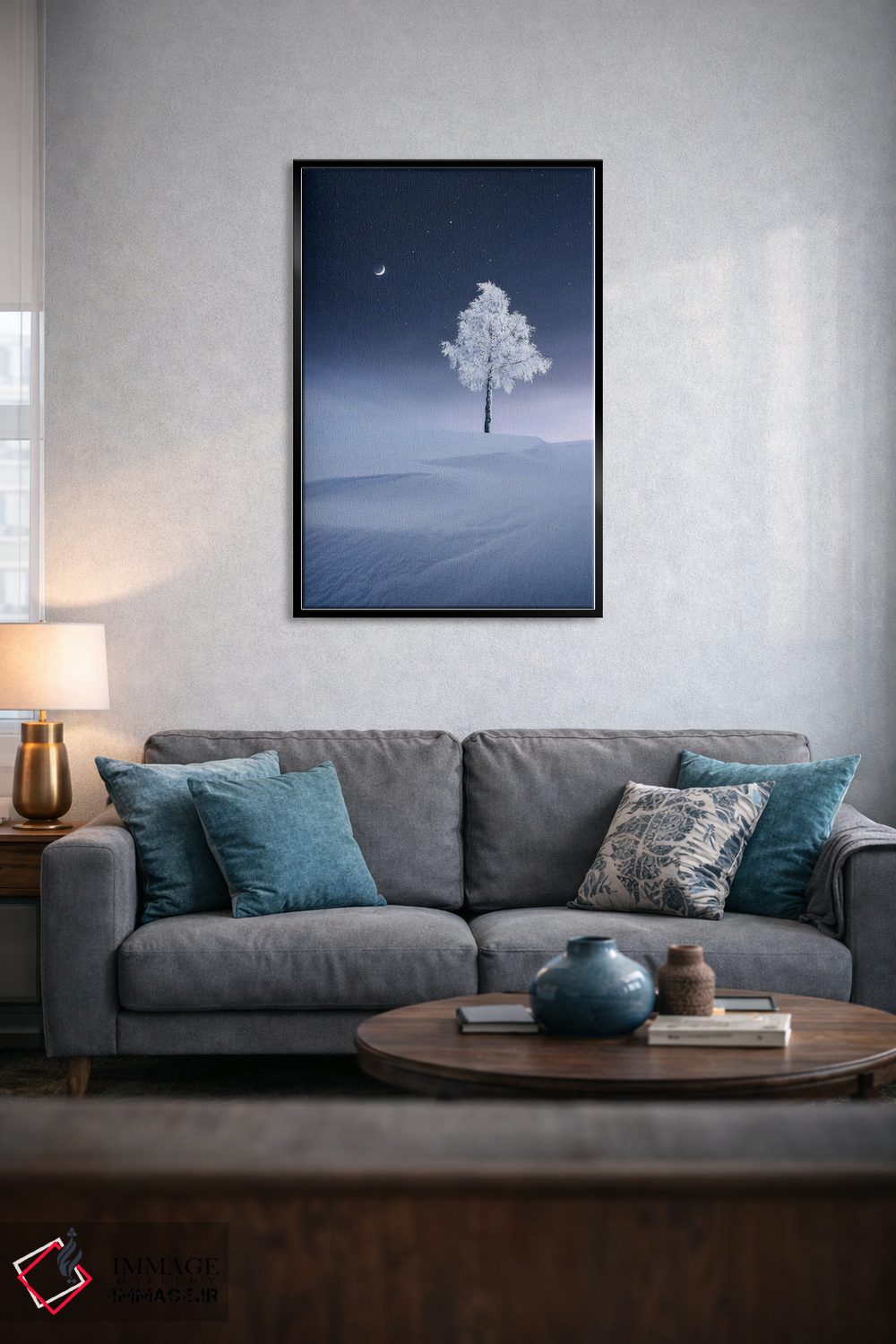 براساس پالت سرد اثر، قاب سفید مات (فریم باریک) پیشنهاد اول است و نقرهای برسخورده (متالیک) مکمل.