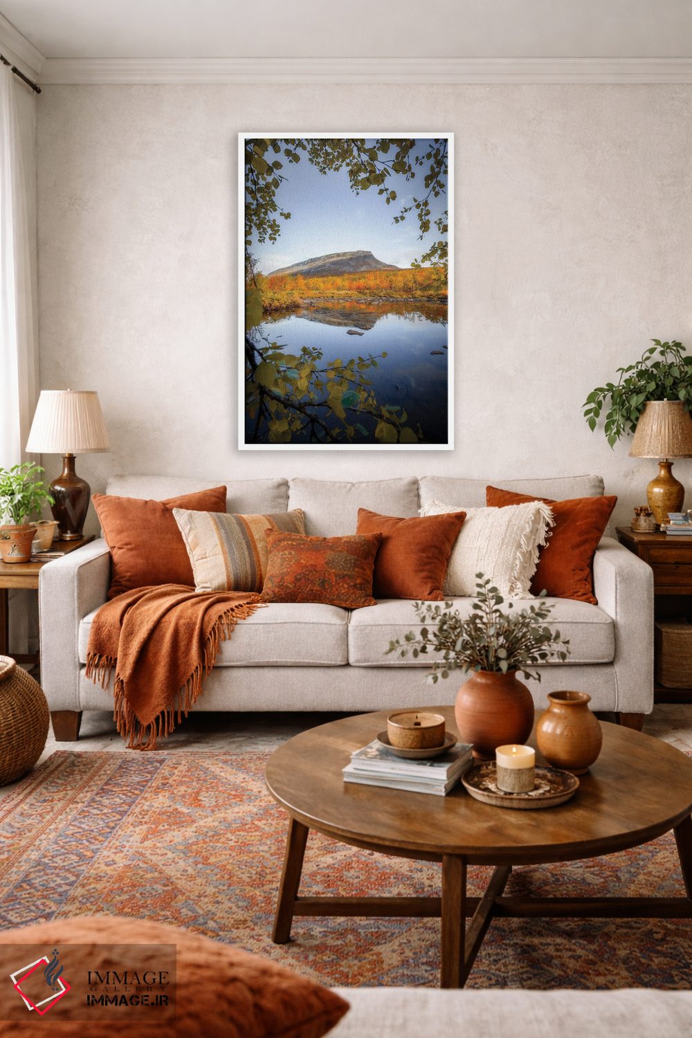 وقتی میخواهید اثر برجستهتر شود، آبی را در فرش یا پرده (بهصورت خیلی کم) جا بدهید تا تعادل بین گرم و سرد بهتر برقرار شود. انتخاب قاب هم میتواند این اکسنت را تقویت کند.