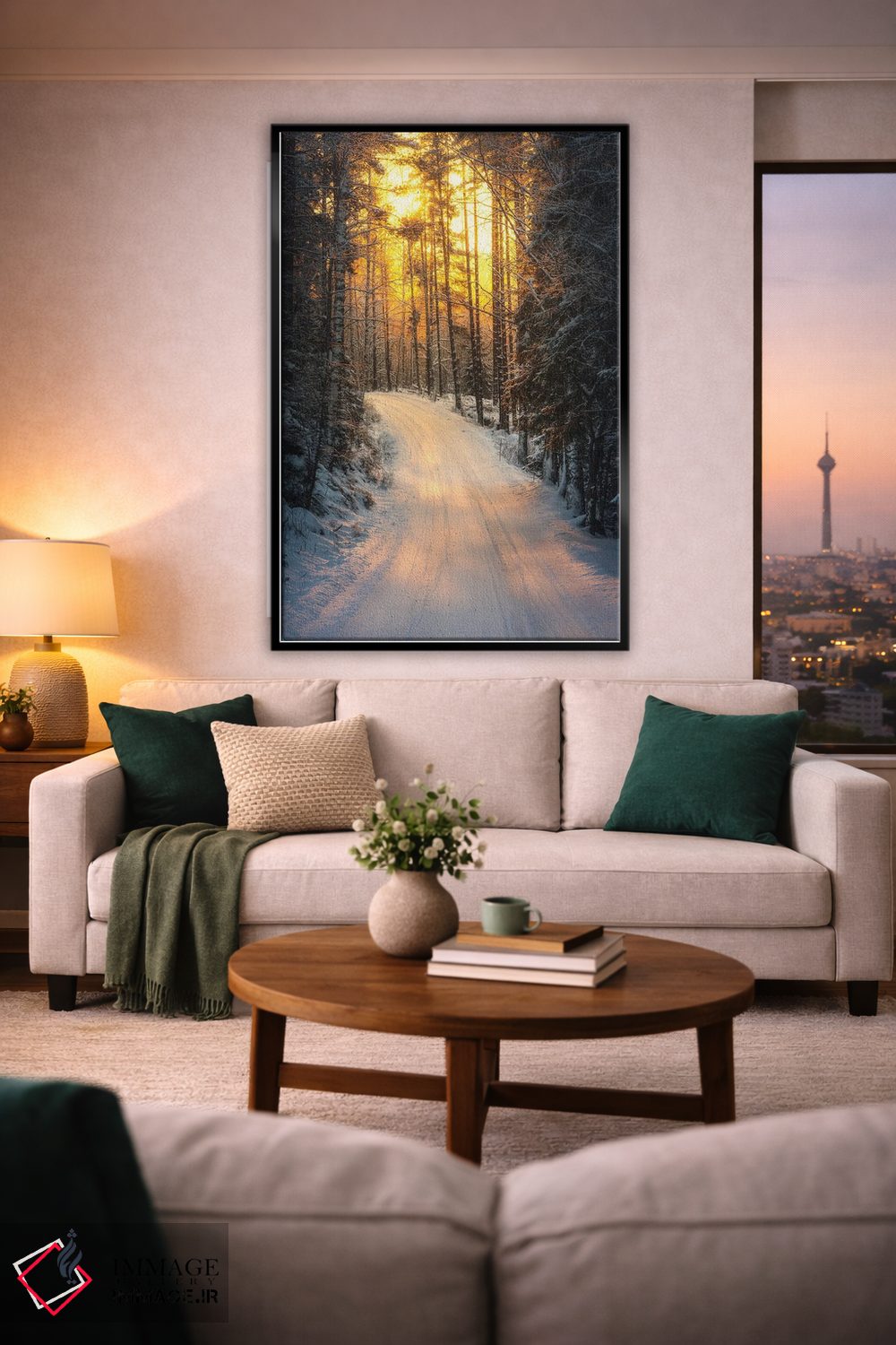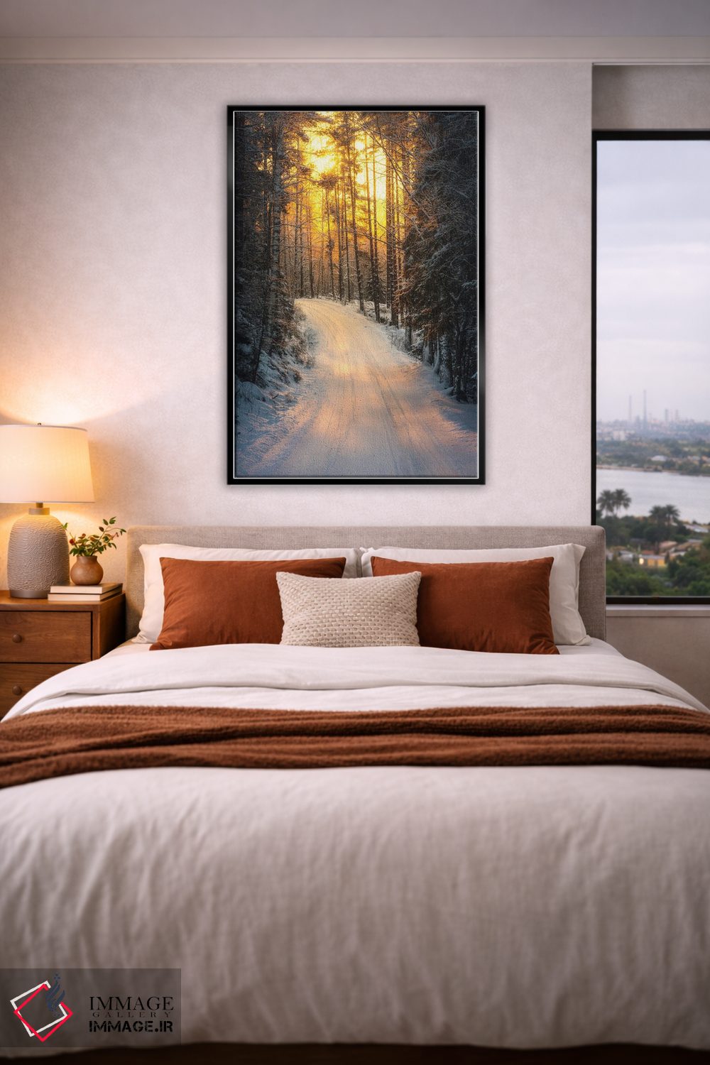 براساس پالت گرم اثر، قاب بلوط روشن (چوبی) پیشنهاد اول است و استخوانی ملایم مکمل. برای سفارشهای پروژهای با ابعاد و قابهای اختصاصی با ایماژ در تماس باشید.